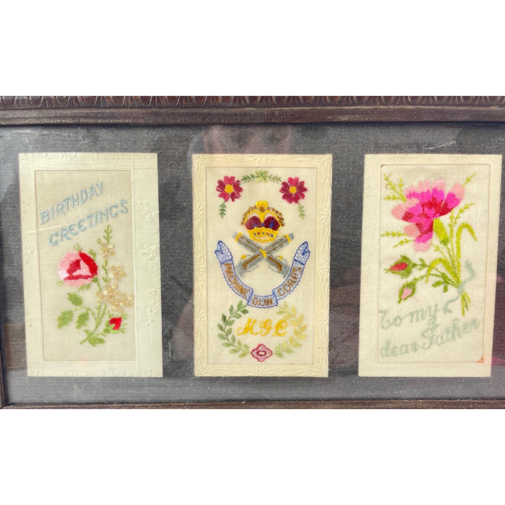 Framed WWI Era hand made Silk postcards. Includes rarer original MGC Machine Gun Corps postcard dimensions of frame 33cm x 20cm approx Approx 1 pieces
