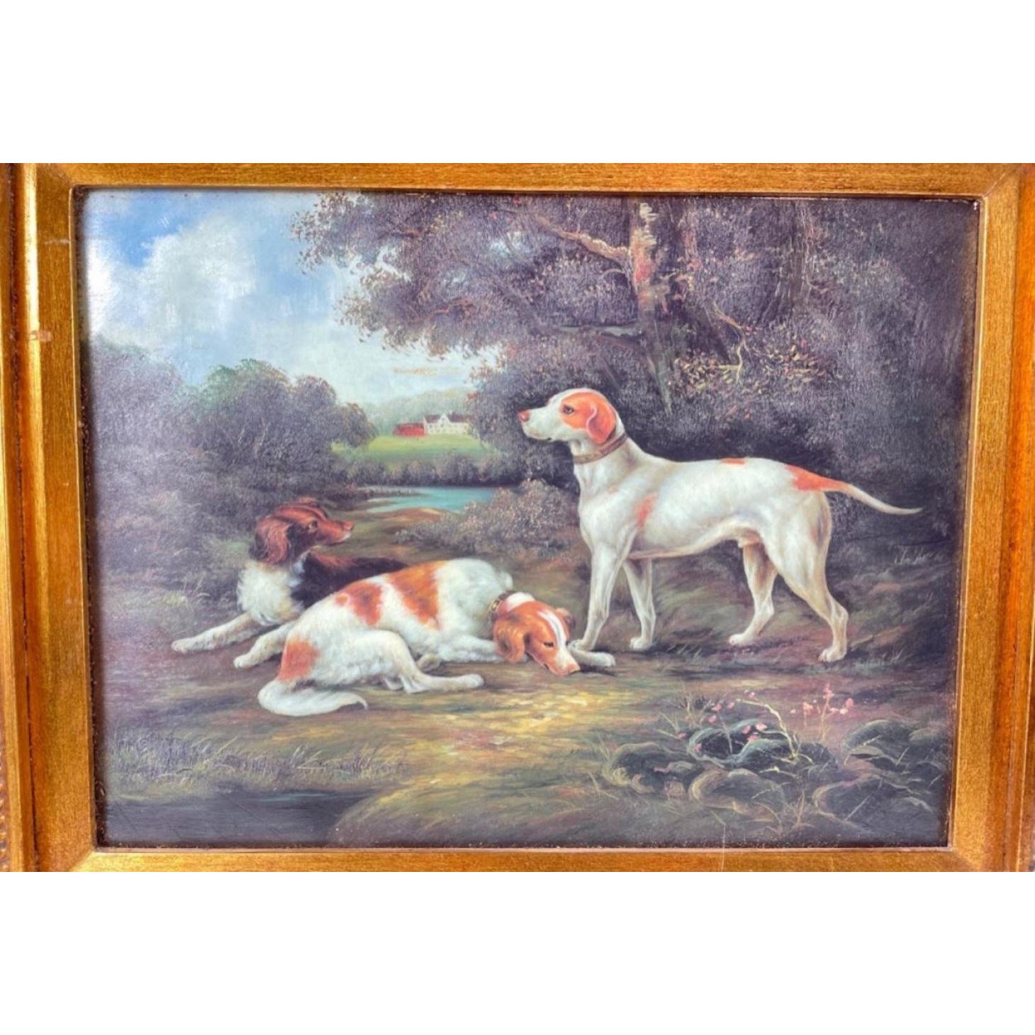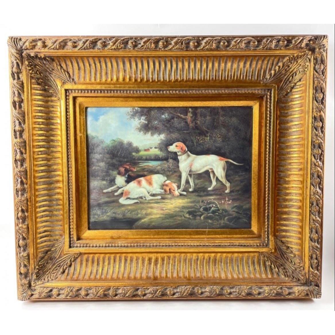 A Pair of Victorian style English School oil paintings within SUBSTANTIAL gilt stucco frames - a trio of hunting dogs within a country setting, the other painting depicting two young girls climbing over a garden wall -