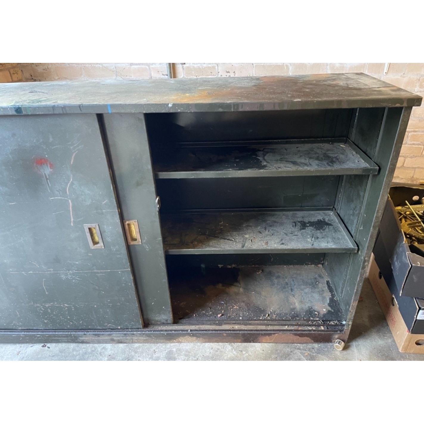 A nice DECORATIVE COMMERCIAL c1950's solid green factory painted metal two door cabinet with six removable shelves- dimensions 6ft x 18" x 4ft in height