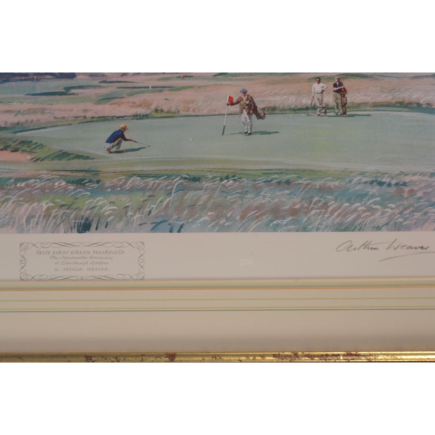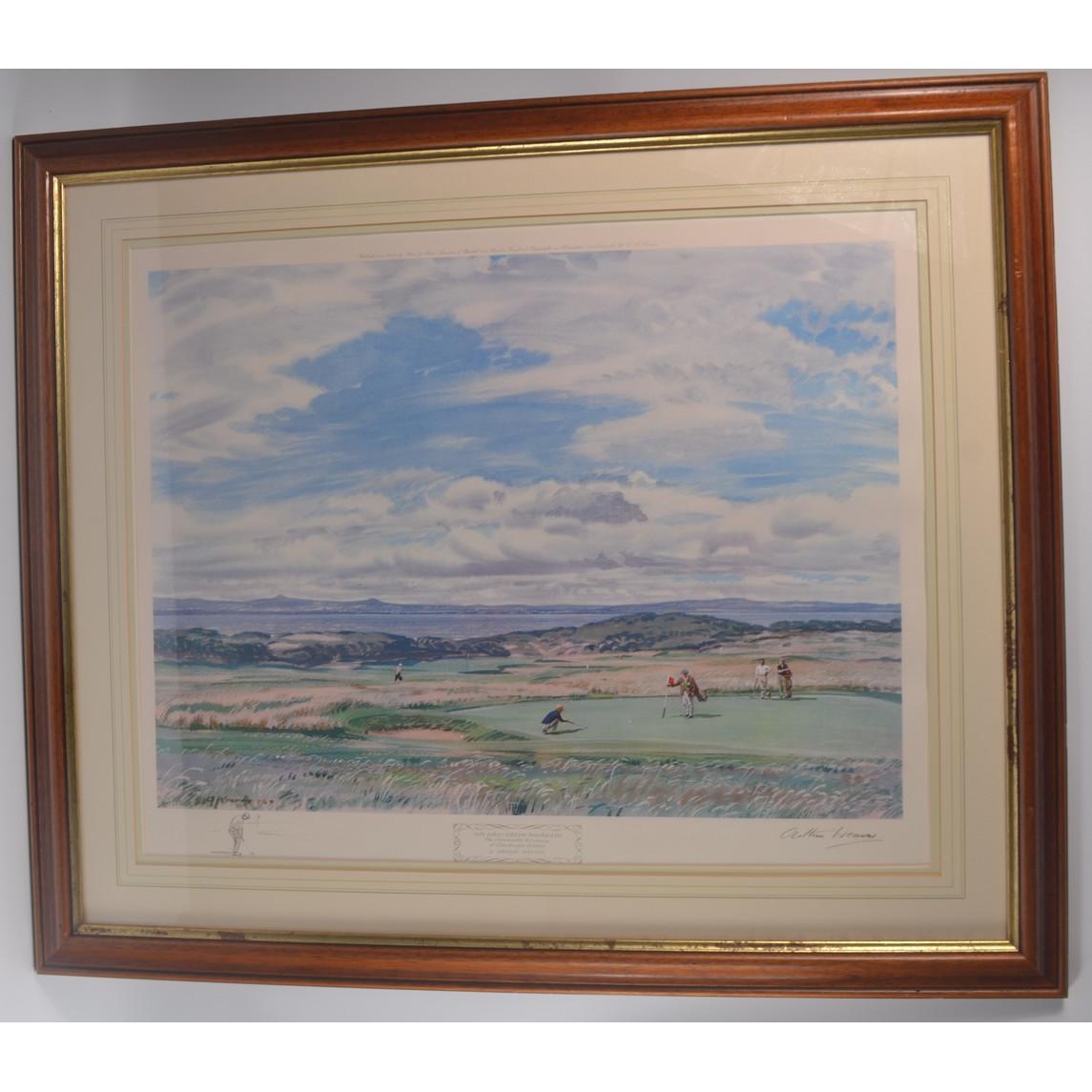 Framed golfing print '1st green MUIRFIELD by Arthur Weaver with artist pencil sketch via the picture mount with accompanying The Golfing Record booklet