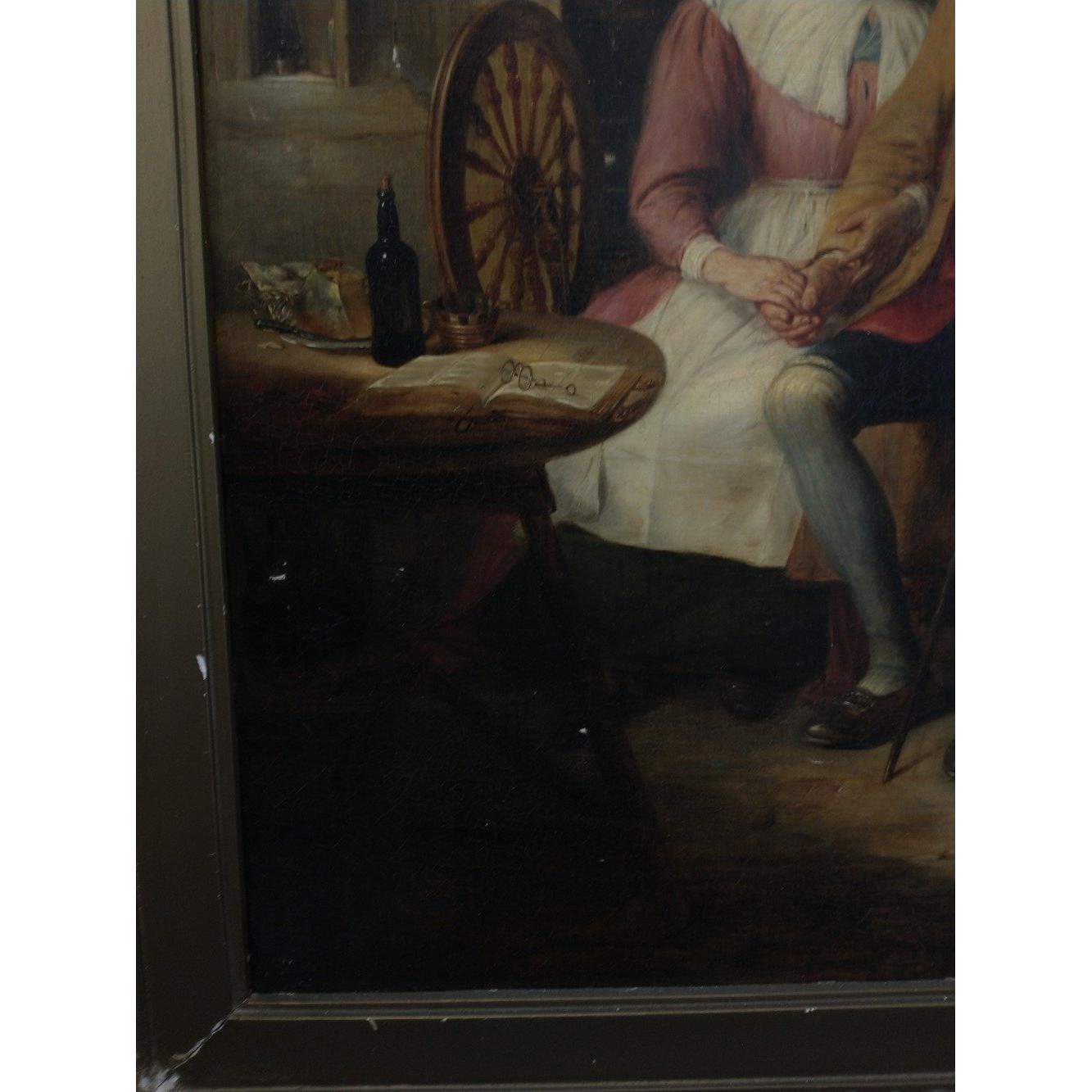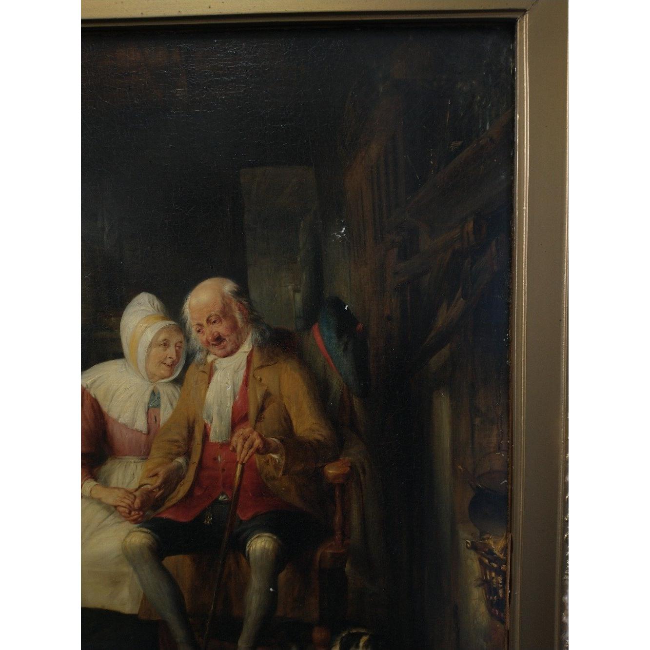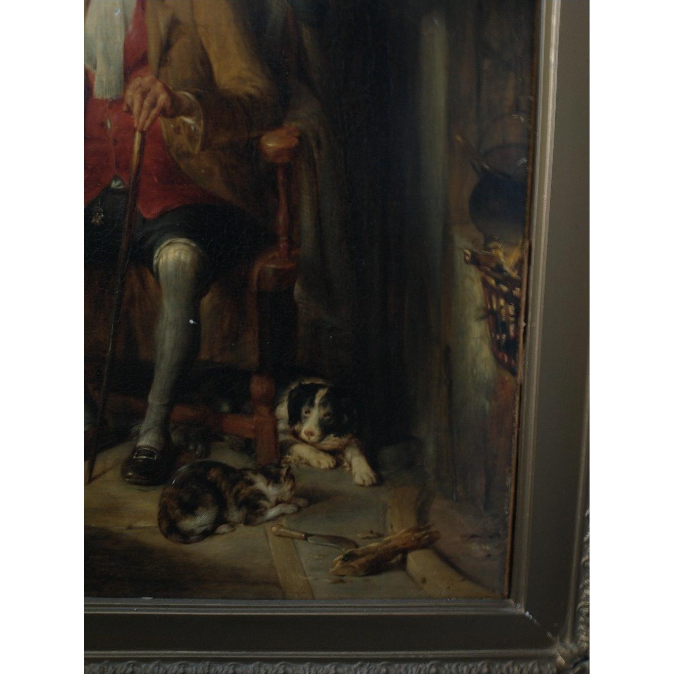 A 19th century IMPOSING Scottish School oil painting, no artist signature, in our opinion in the style of William Kidd HRSA Scottish | Circa 1790 - 1863 , oil on canvas Scottish Country Scene circa 1830's of an elderly couple sitting by the fireside, frame size 93 x 81cm, visible canvas 66cm x 53.5cm, the gesso frame needs some repair (but most has been saved within a separate bag)