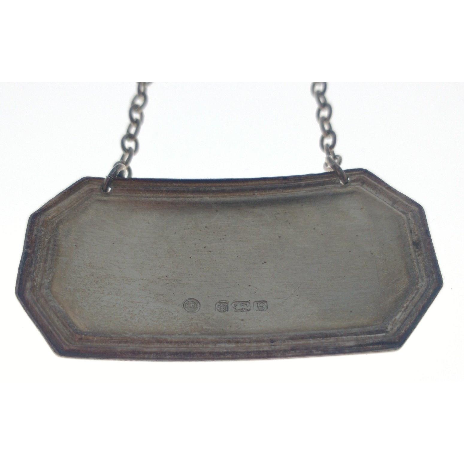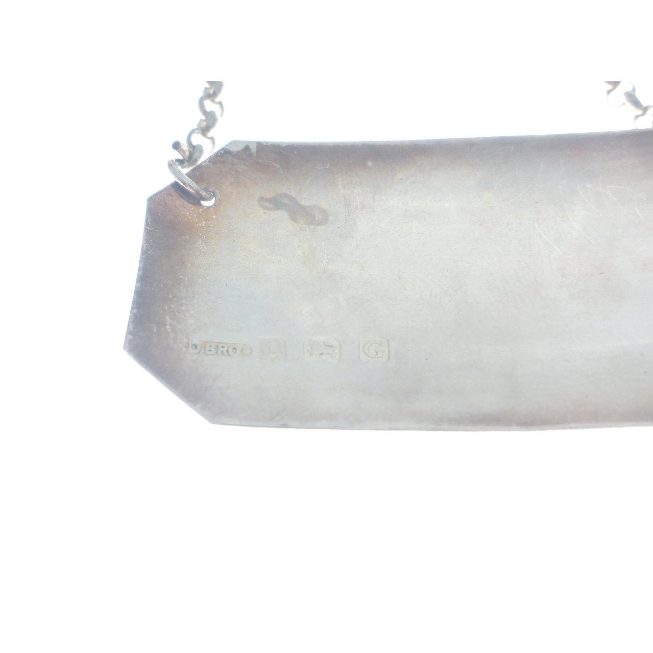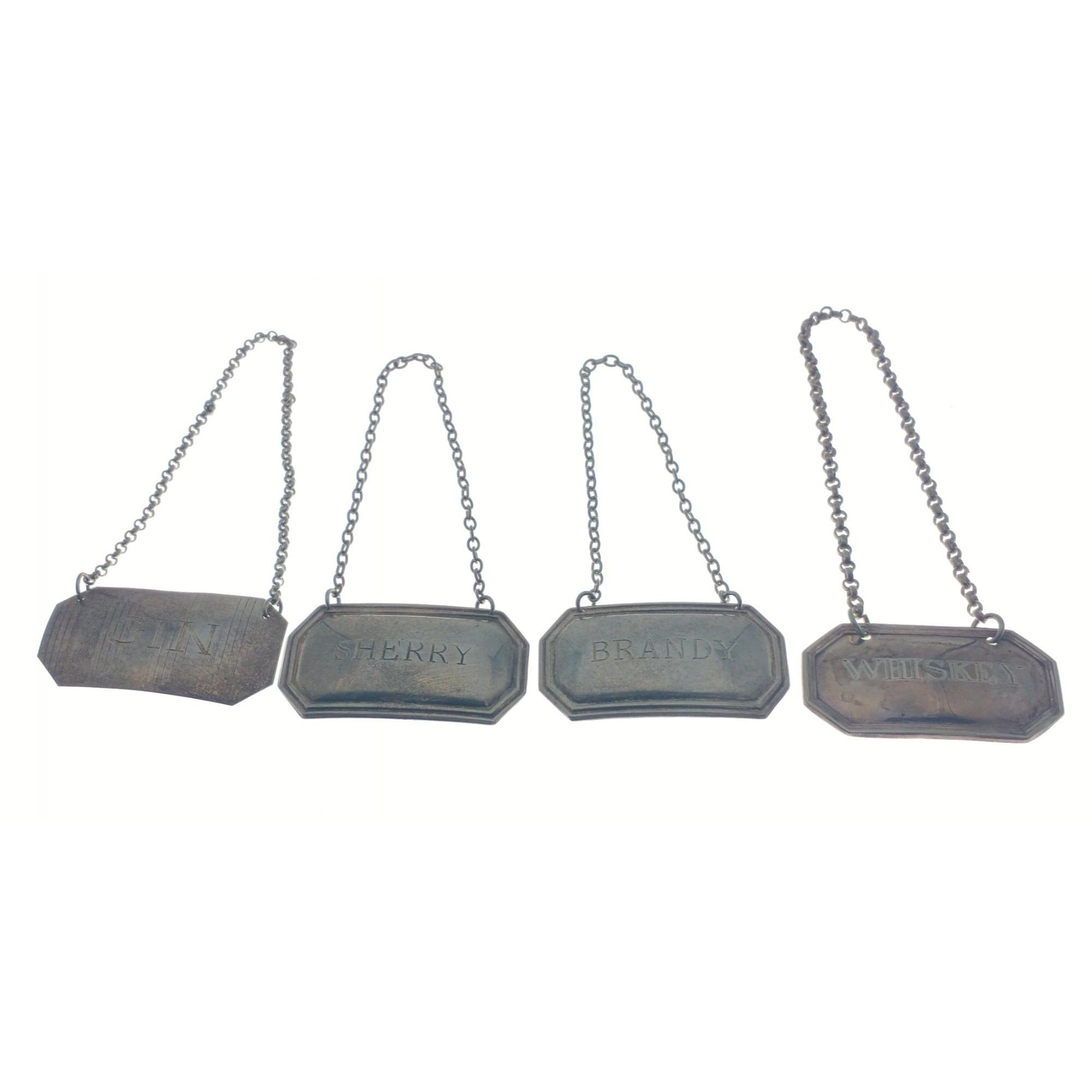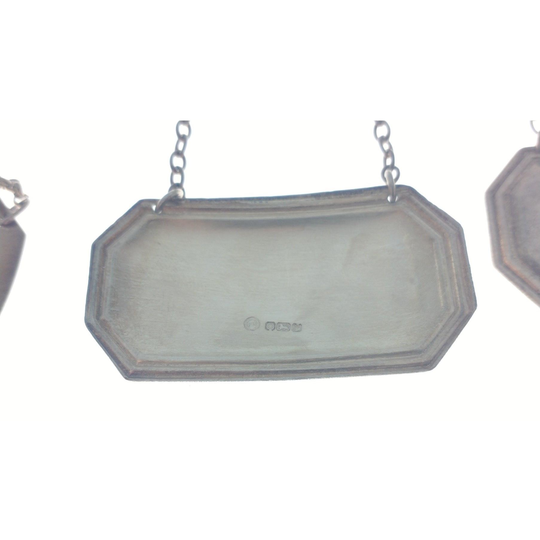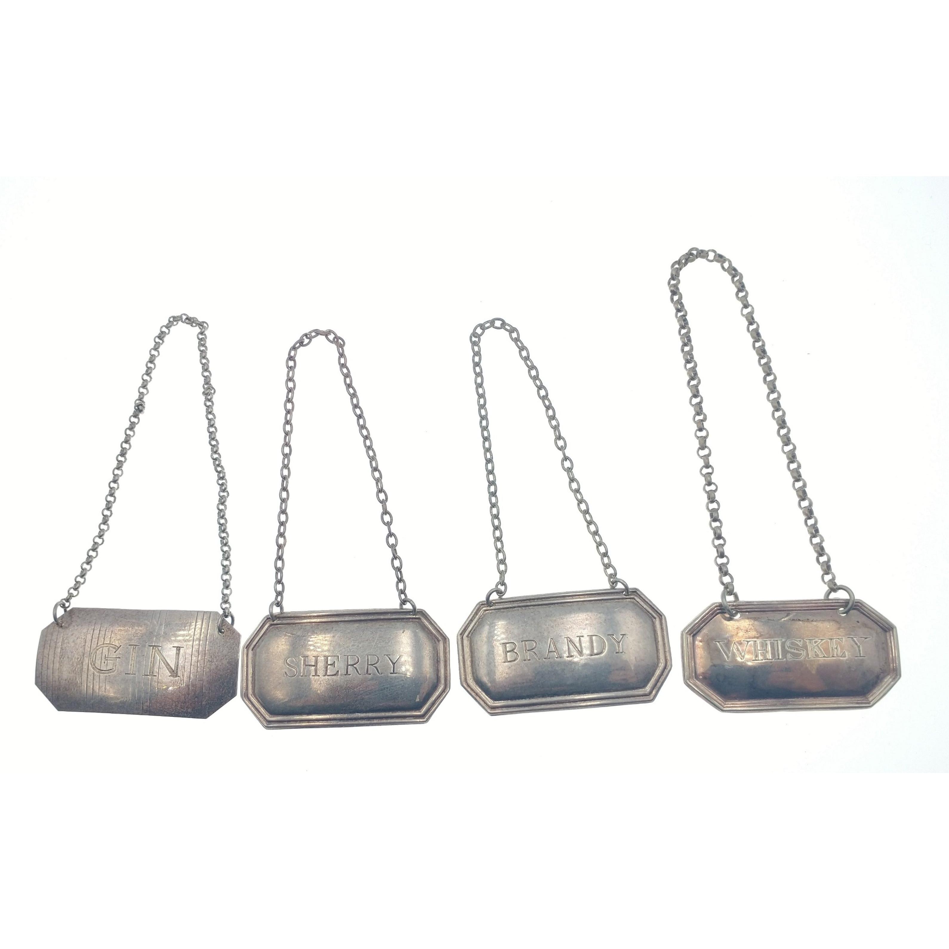 Three silver hallmarked decanter labels SHERRY - Sheffield 1977 by Francis Howard, BRANDY - Sheffield 1976 by Francis Howard, GIN - Birmingham 1931 by D Bros, total gross weight 27.3g plus a WHISKEY label