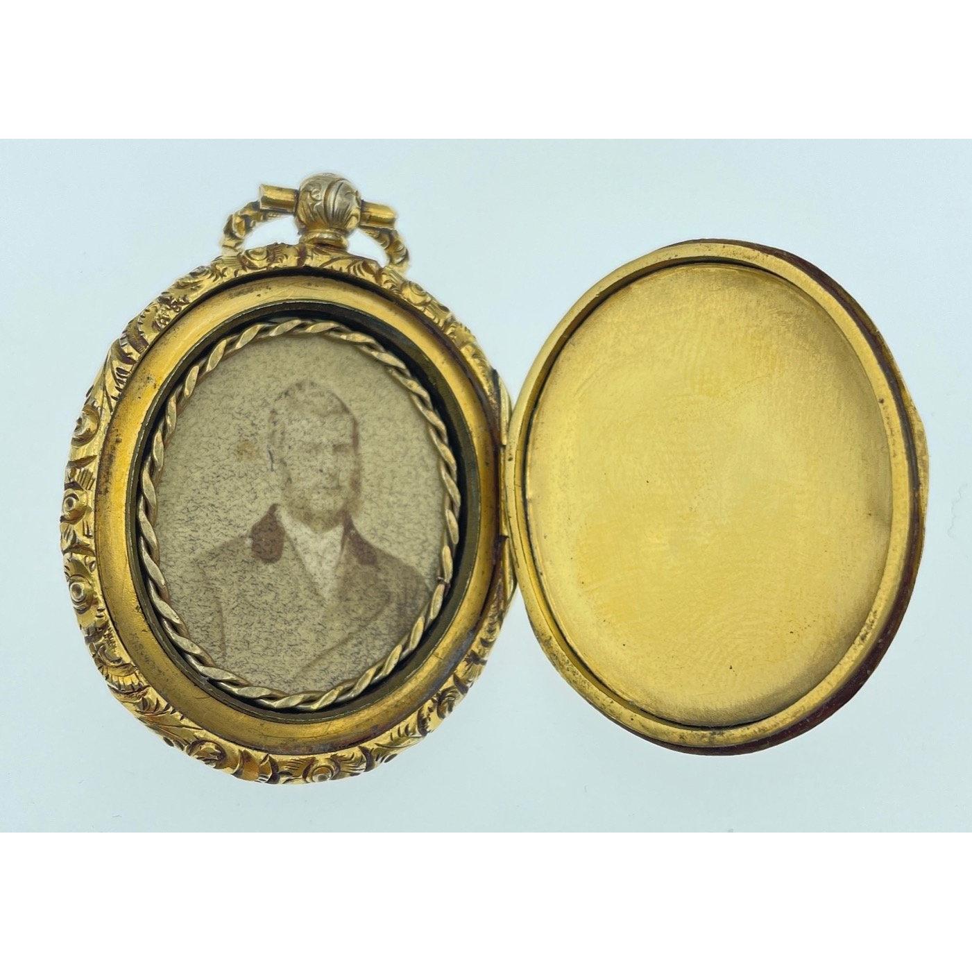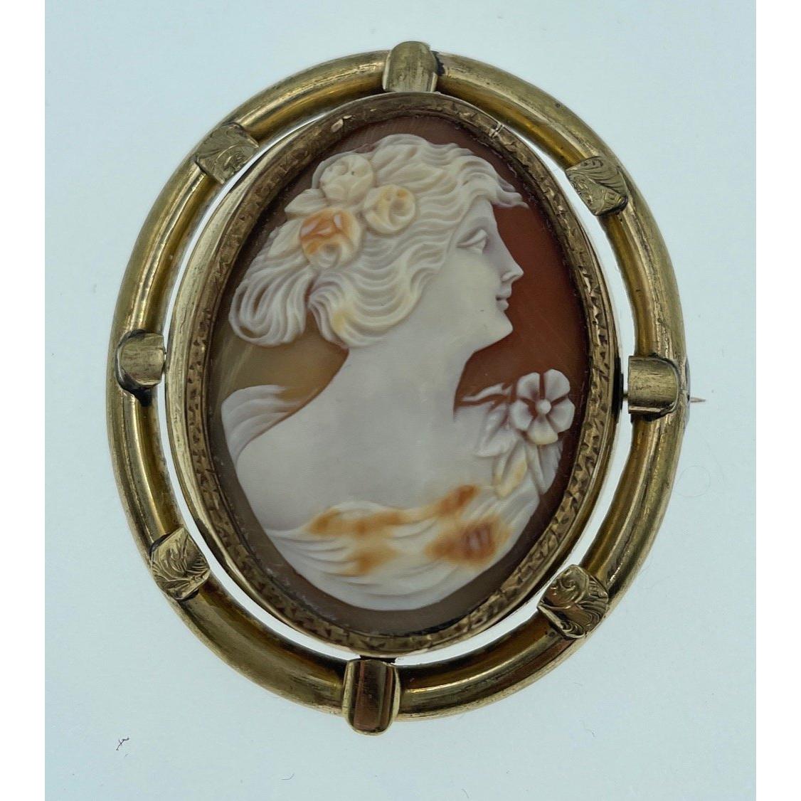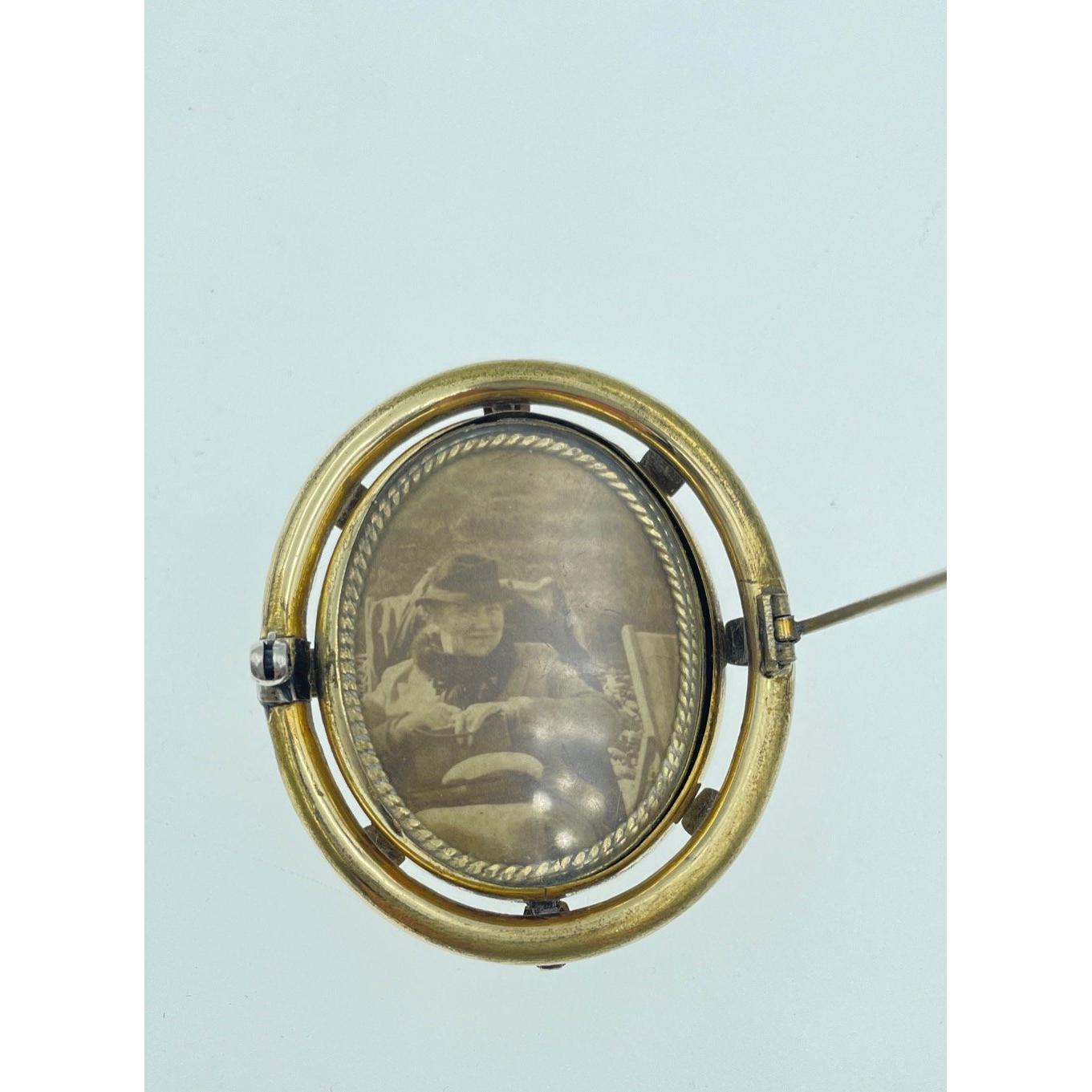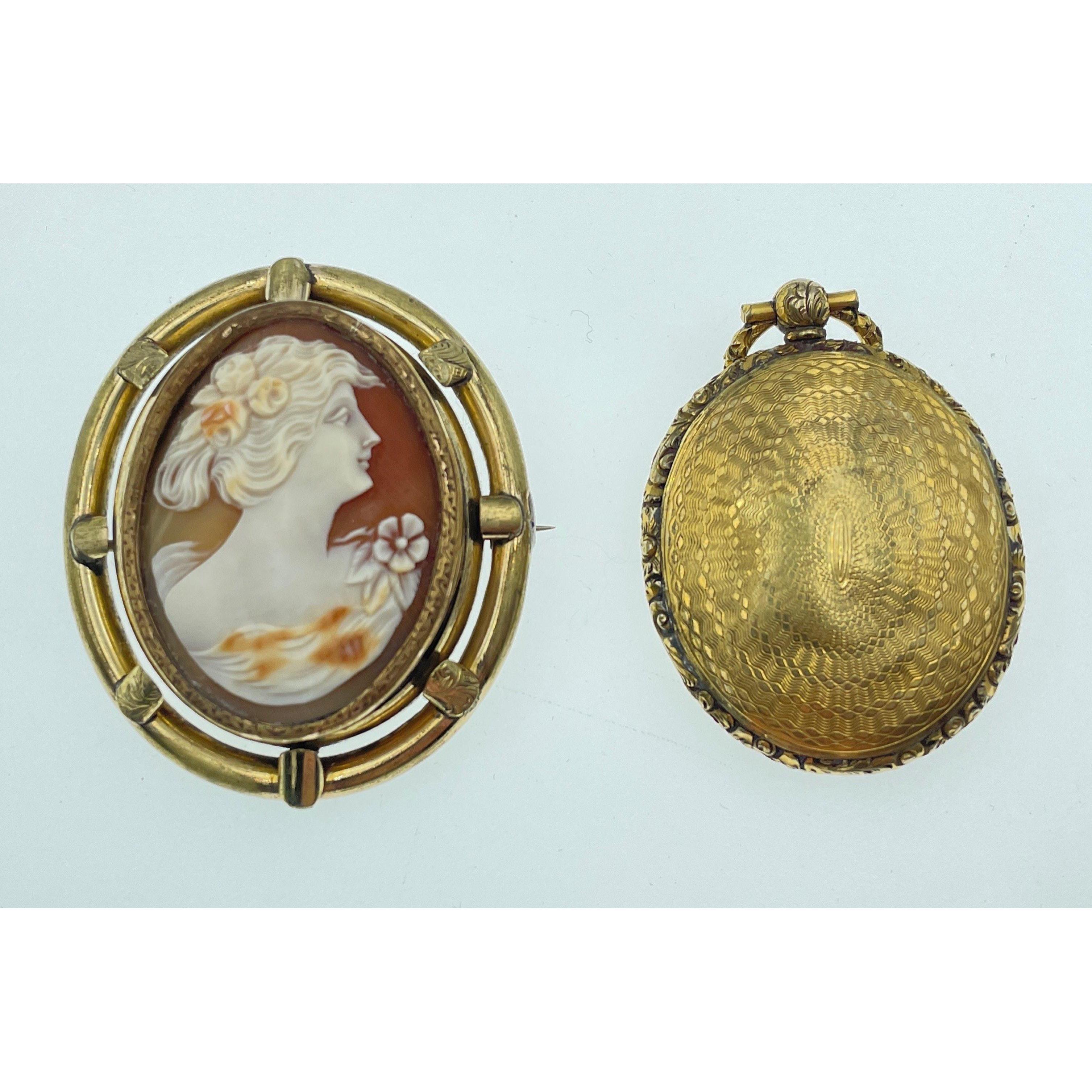 Two vintage lockets to include an unusual yellow metal reversible cameo brooch with intricate detailed lady on one side and photo frame on other currently with photo of elederly lady outside (L: 5cm approx W: 4.5cm approx), other a yellow metal oval shaped locket with engine turning and scrolling leaf design, currently with black and white photo of bearded gentleman in jacket, tests as 9ct gold (L: 4cm W: 3.5cm approx)