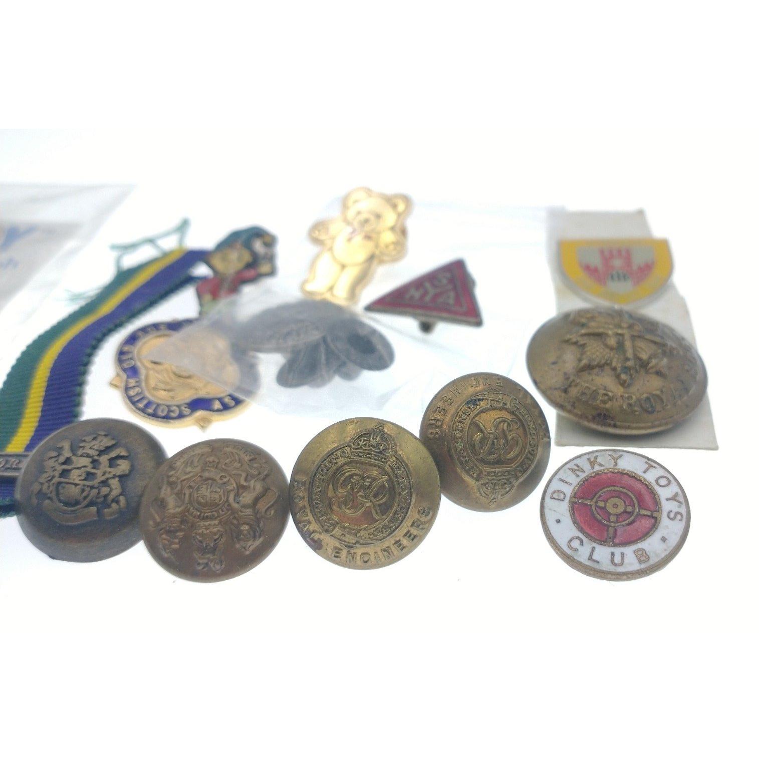 A mixed collection of buttons and badges to include a pair from THE ROYAL ENGINEERS, one from THE ROYAL SCOTS, a ribbon and bar from the TERRITORIALS, a badge from THE NODDY CLUB, THE DINKY TOYS CLUB, the SYHA, the SCOTTISH OLD AGE PENSIONS ASSOCIATION, etc
