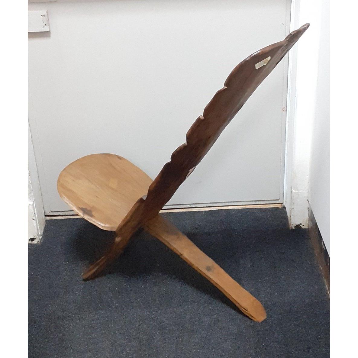 Interesting South East African wooden CHIEFTAINS/BIRTHING CHAIR carved with stylised lions. Small older label on rear reads ''The African Collection, Fountain of Knowledge. A collection of manmade crafts carved by the Artists of Africa, Malawi. Lovely item in two pieces. Back stands approx 42"