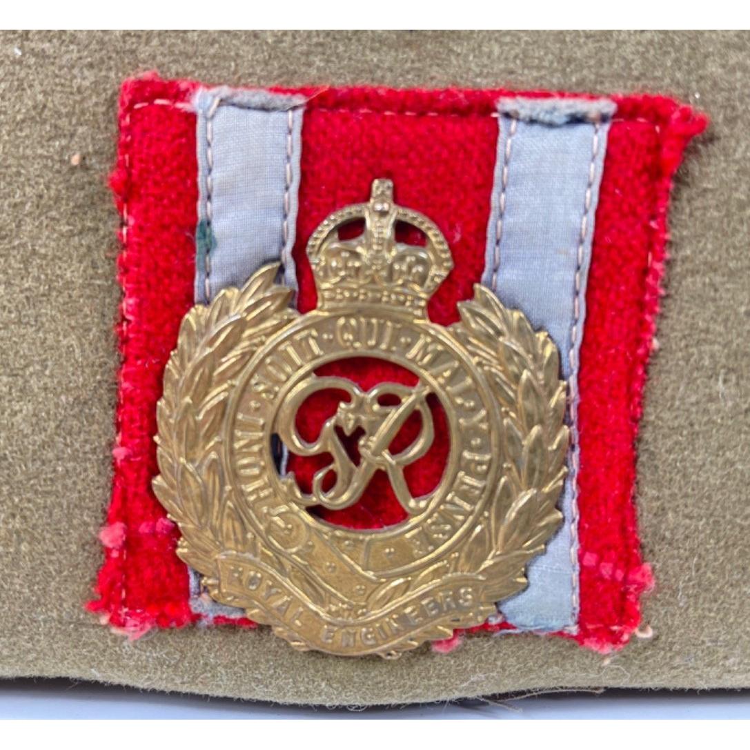 Military Headgear / Headwear. ROYAL ENGINEERS TROPICAL BUSH HAT, Khaki felt hat with turn up brim to the left side and fitted with a silk Royal Engineers pagri badge. Nice original condition, strap broken and some creasing and minor stains