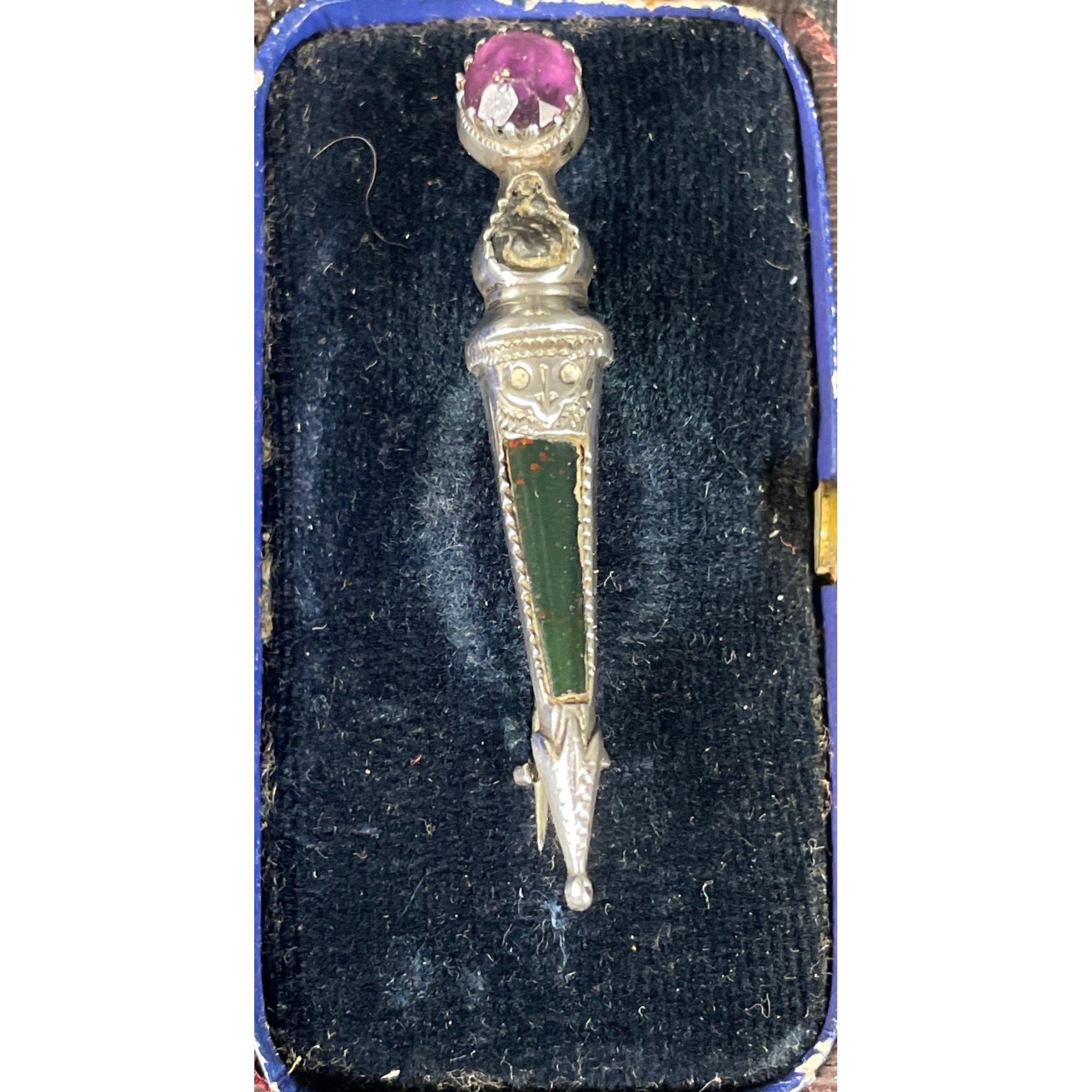 A small silver PIN BROOCH in the shape of a Scottish dirk or dagger, purple coloured stone with polished stone shaft. Marked silver to rear and complete with pin in Hamilton Jewellers Box. 45mm long, gross weight 2.81g
