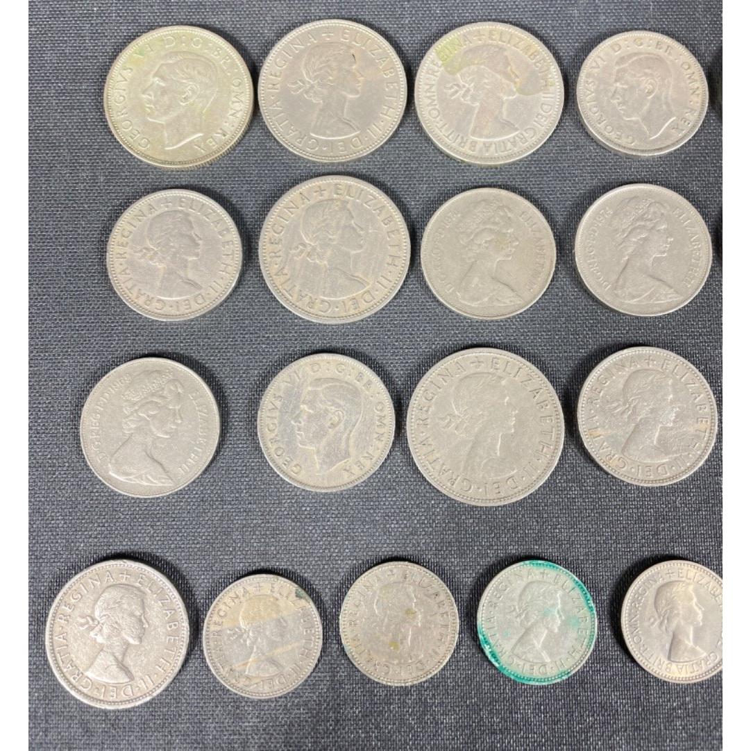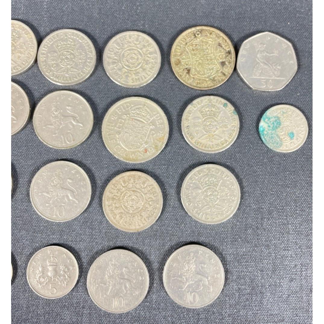 A collection of BRITISH vintage 'silver' pre-decimal coins (and some decimal 10 pences) to include Two Shilling coins, Half Crowns 1955-57, one shillings etc etc - all within a small Cadbury's cocoa tin!