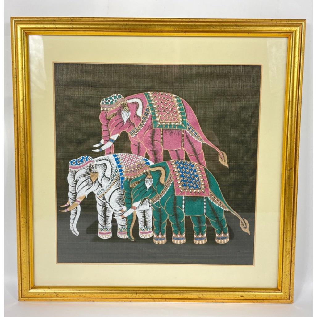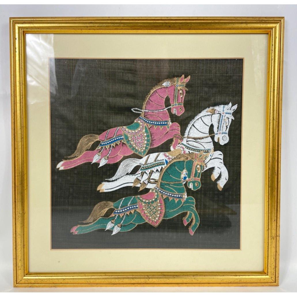 Two complementary silk paintings of three caparisoned horses and elephants frame size 40x40cm approx, visible work 28x28cm approxApprox 2 pieces