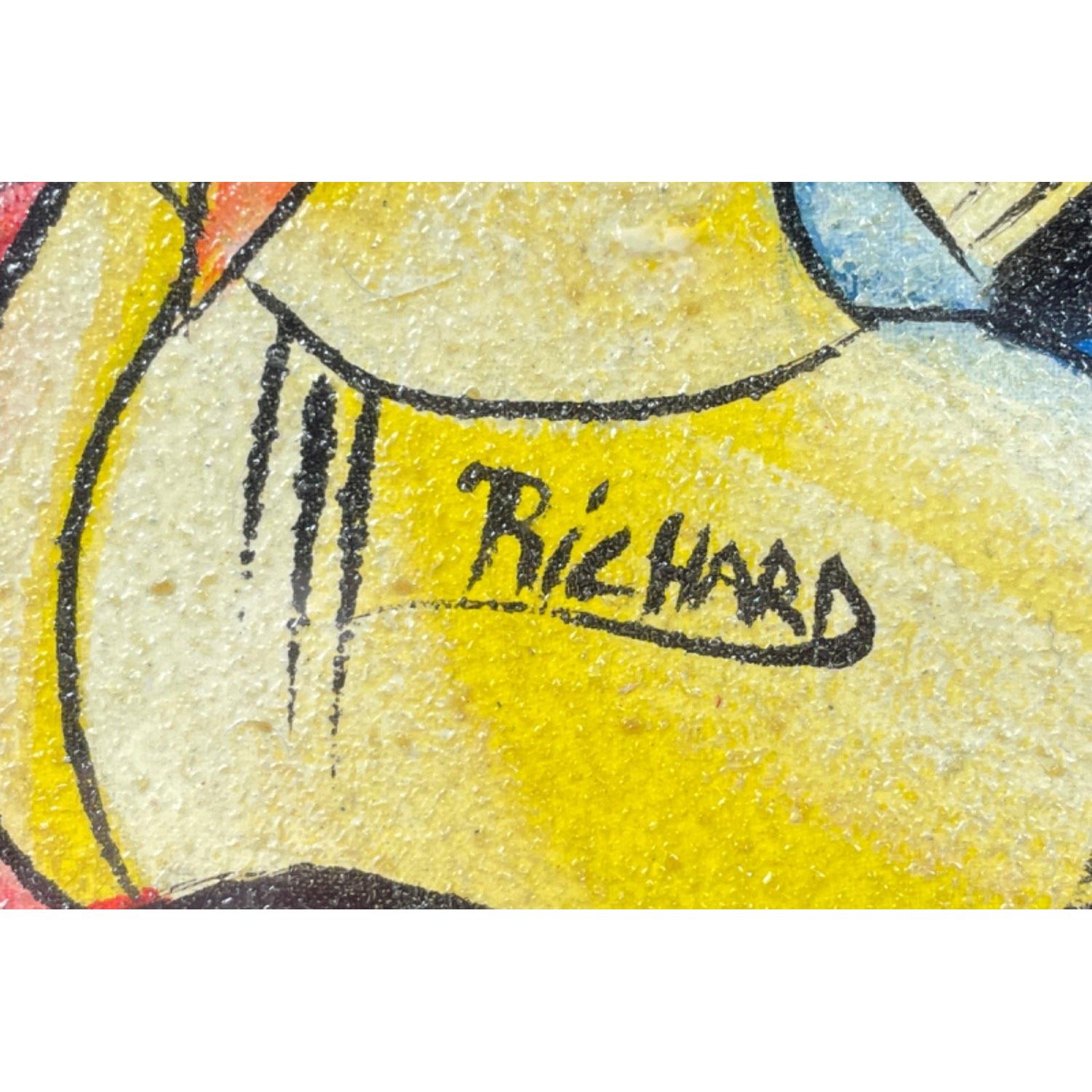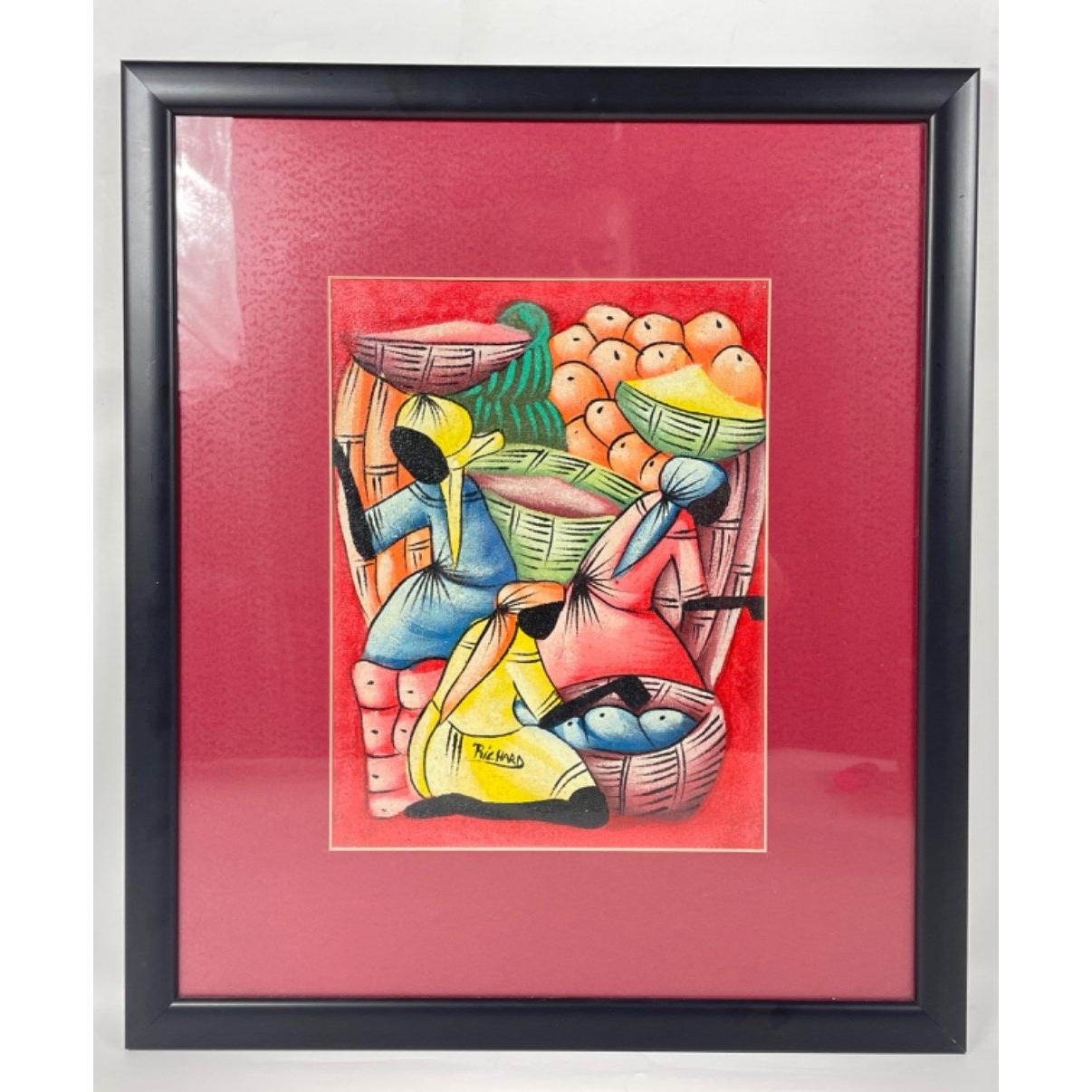 Two original artworks by Kenyan artists 'Richard' and 'Eddie JA' of local ladies working in the fields frame size 38x35cm, visible work 21x18cm) and at the market (frame size 43x36cm visible work size 25x19cm)