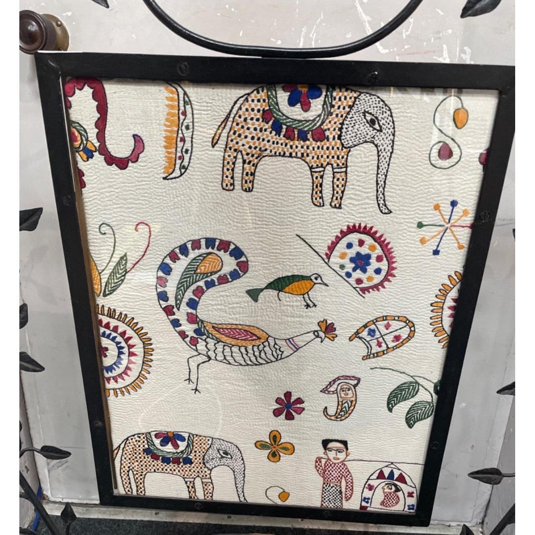A large wrought iron effect fire screen with a decorative artistic centre panel depicting decorative and colourful animals - dimensions 72cm x 104cm heightApprox 1 pieces