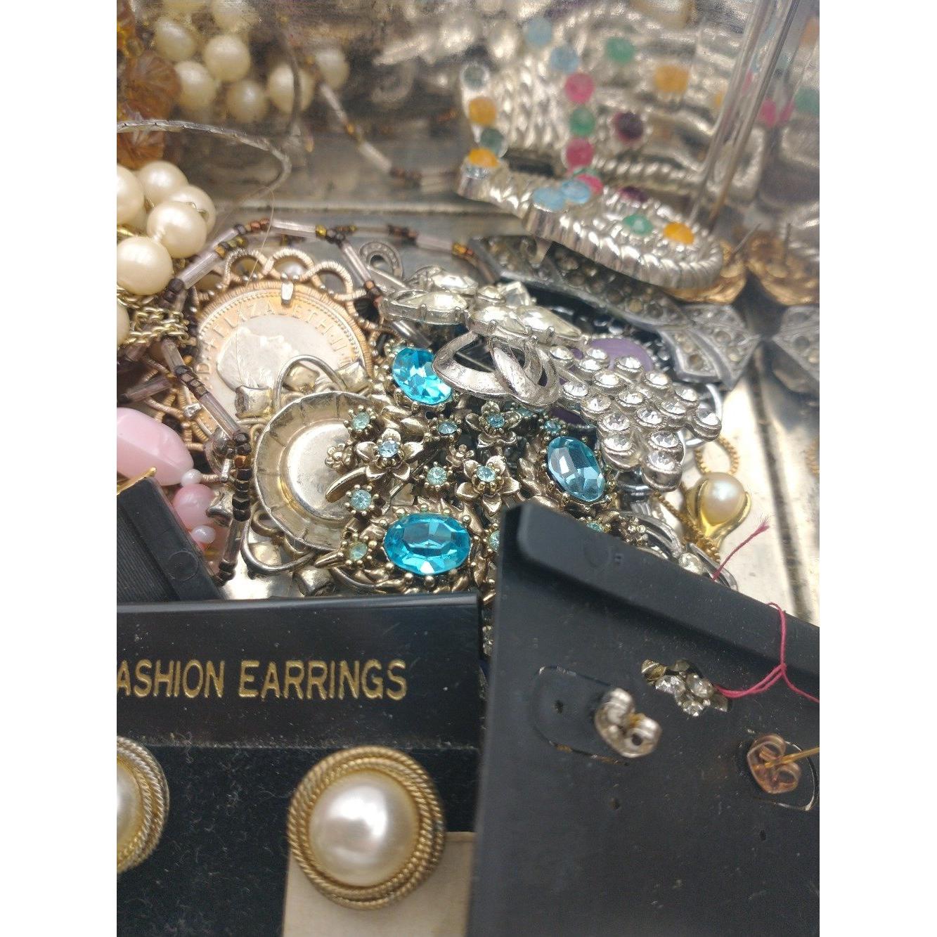 A MacFarlane Lang biscuit tin loaded with costume jewellery including brooches and fashion earringsApprox 1 pieces