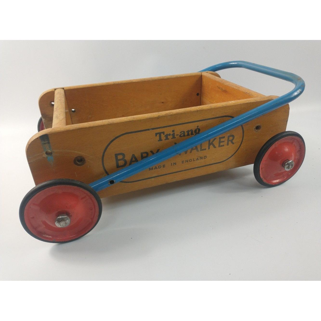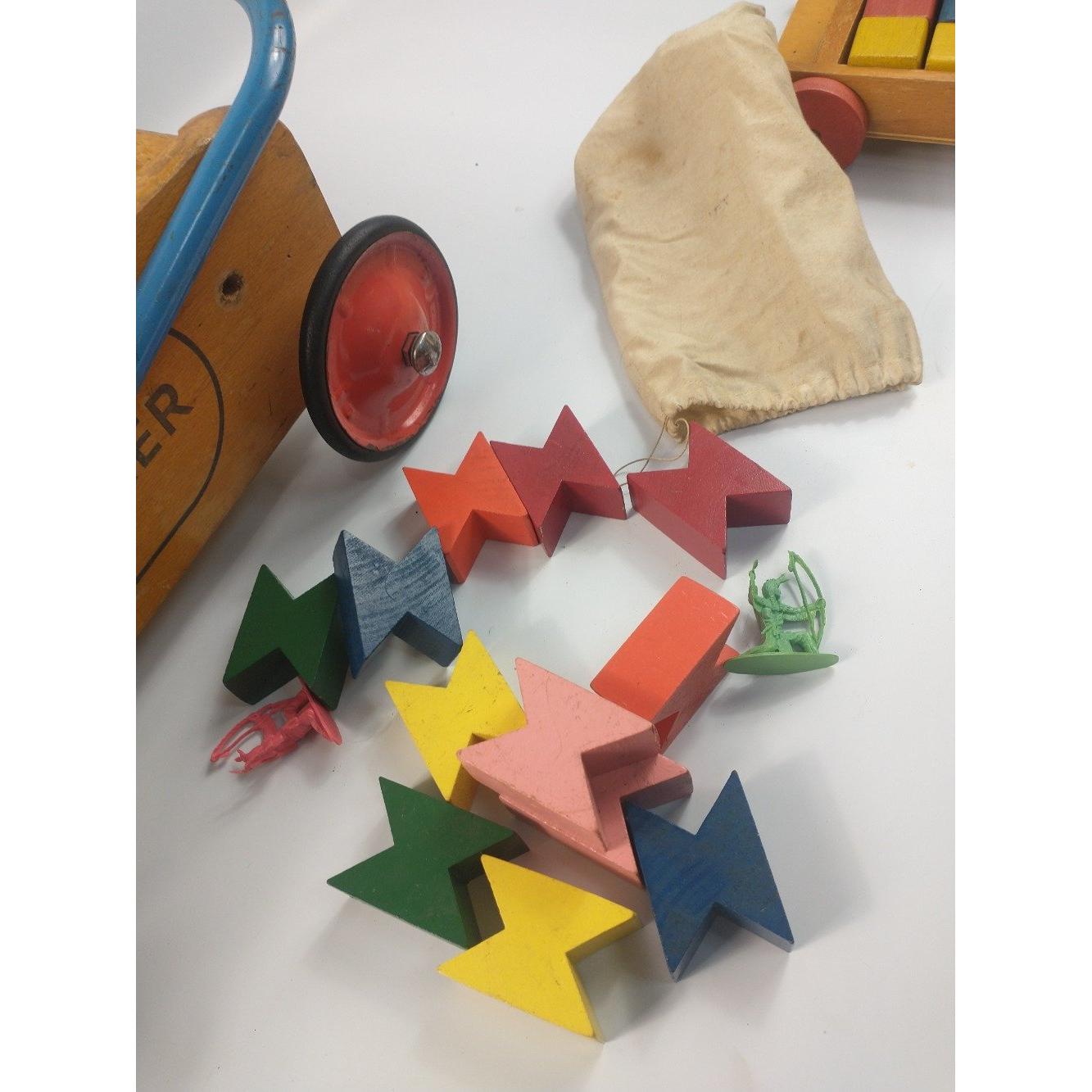 A VINTAGE c1960's TRI-ANG Baby Walker 40cm x 25cm approx with a pull-along building bricks small cart with string lead. -30 cm x 18cm with a spare sack of coloured building shapes and bricks