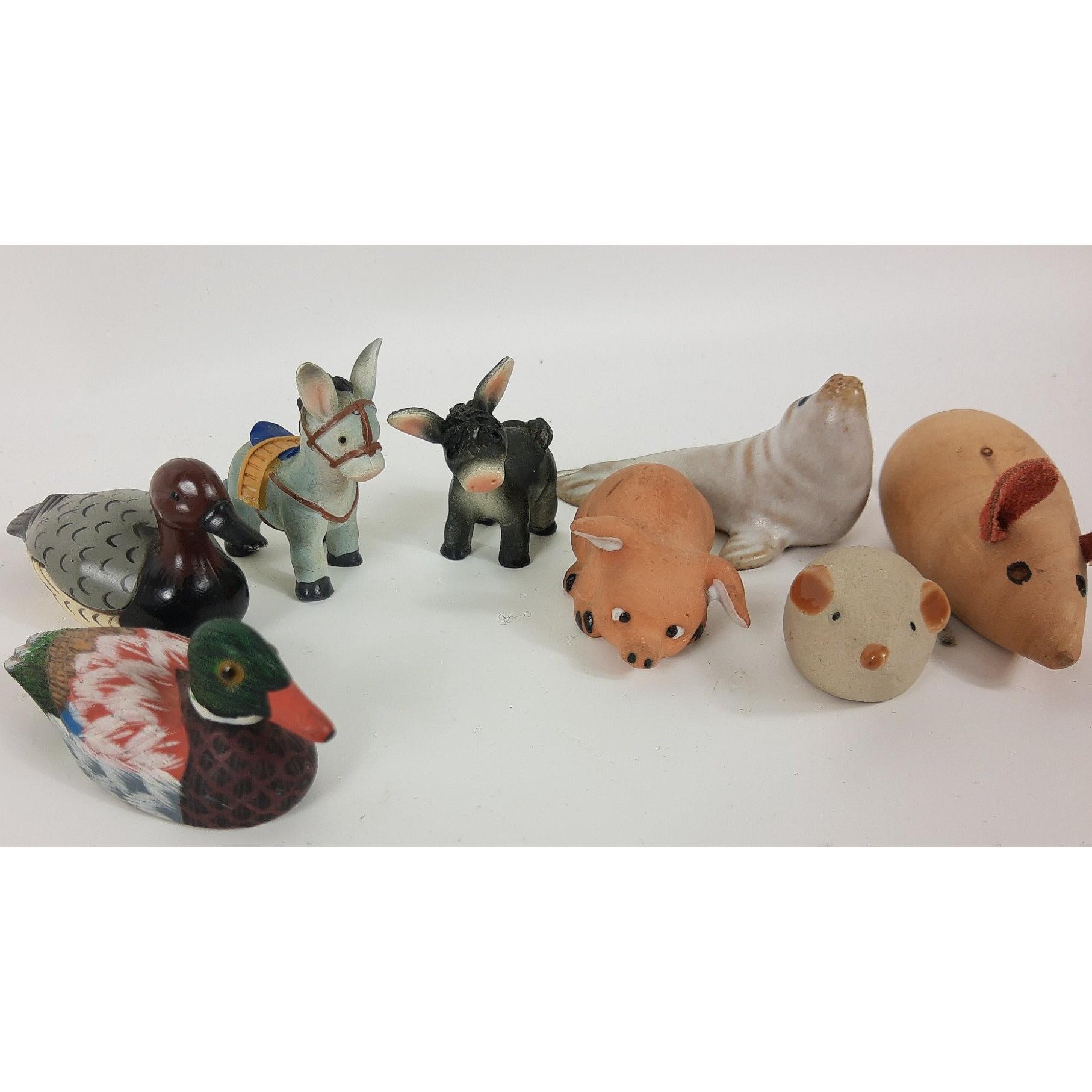 A charming collection of six ceramic ducks including two who like to spy over the edge of the shelf, tallest stands 24cm high plus a selection of whimsies including donkeys, mice and more ducks