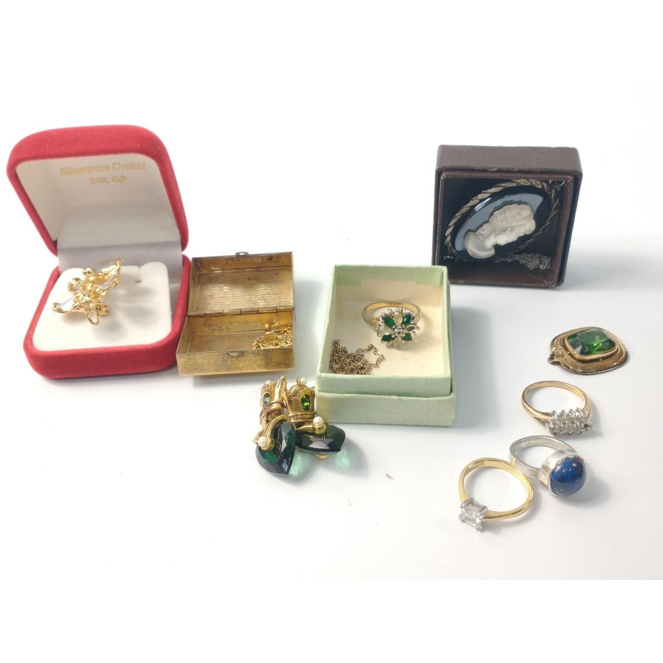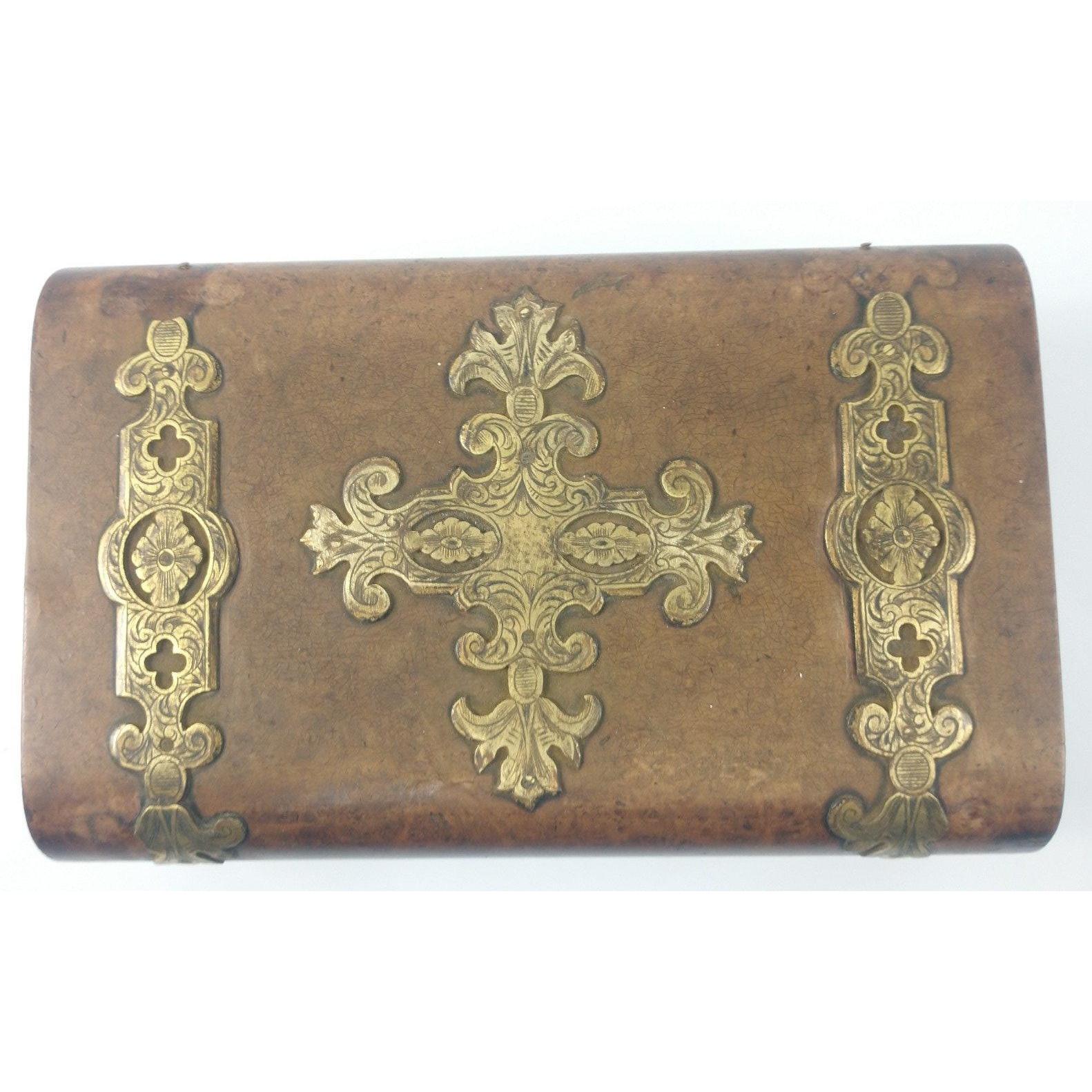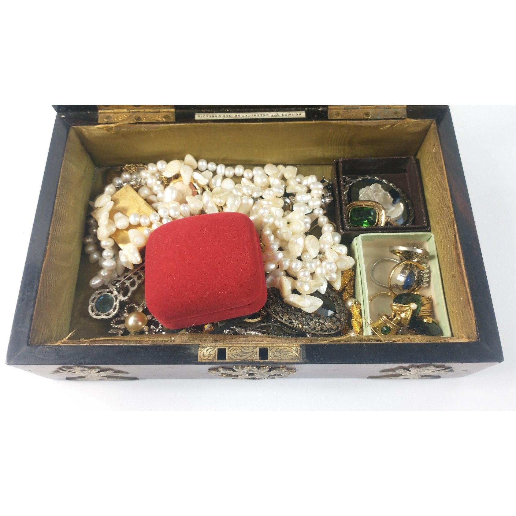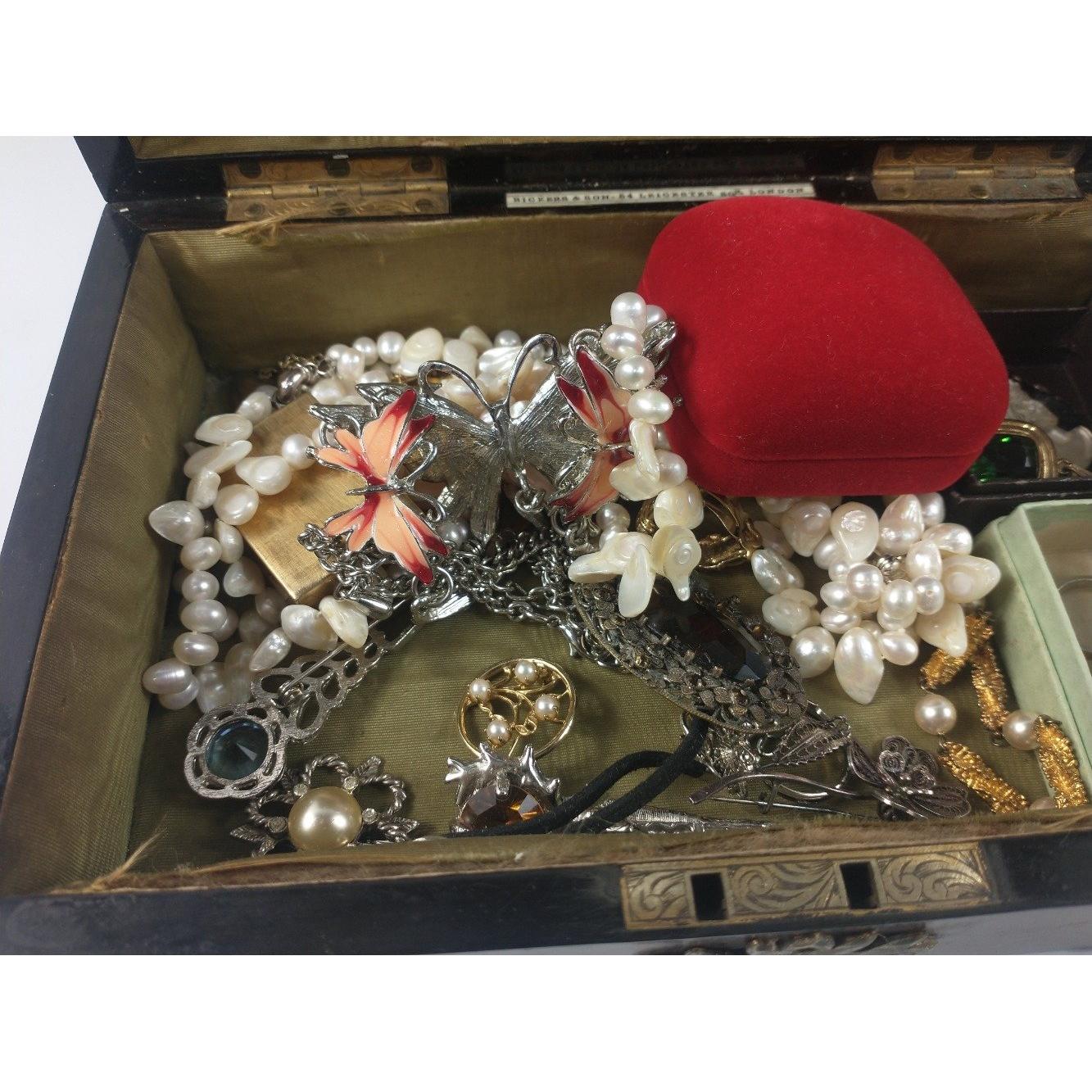 An outstanding antique walnut stationery box with ornate brass escutcheons made by BICKERS & SON of 54 Leicester Square, London (1832-1940) (2 small pieces of escutcheon missing but have to look closely to see it) with contents of costume jewellery including a 24K gold-plated Singapore Orchid