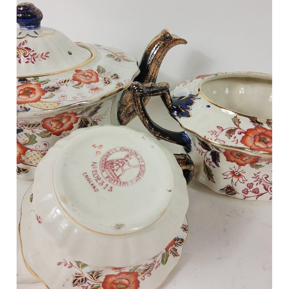 A Samuel Johnson BRITANNIA Pottery floral teapot with gilt highlight plus matching milk jug and twin-handled sugar bowl (tiny chip on rim) and an additional white with gold teapot (no maker's mark)
