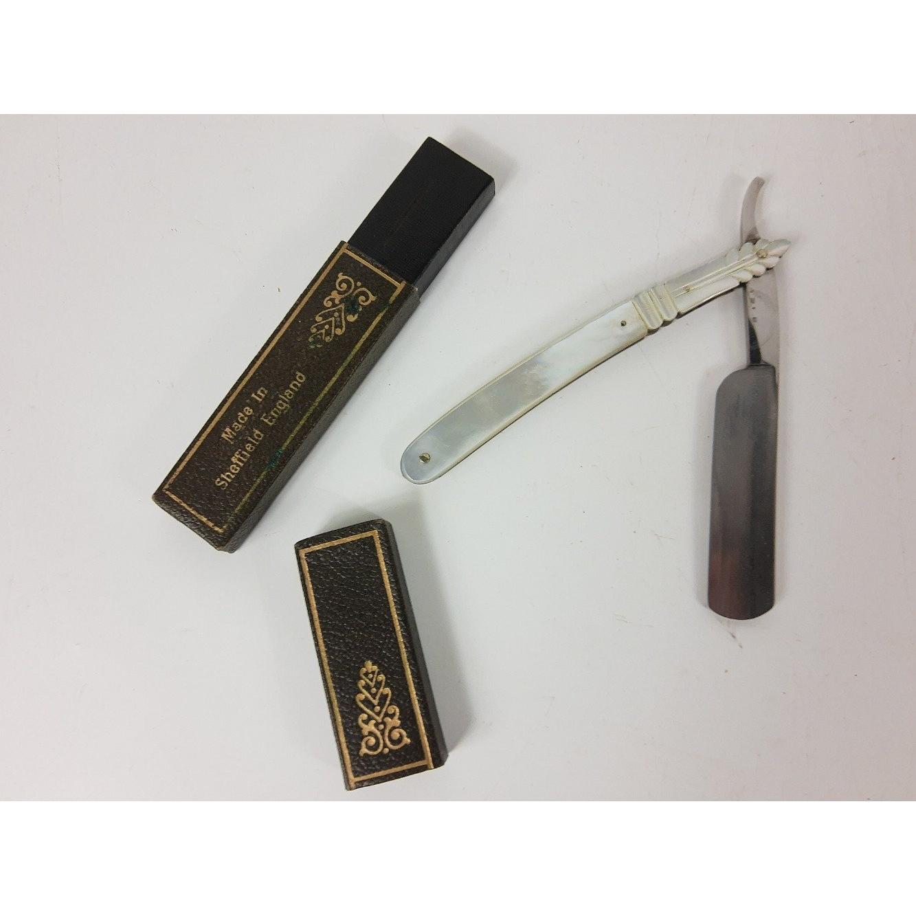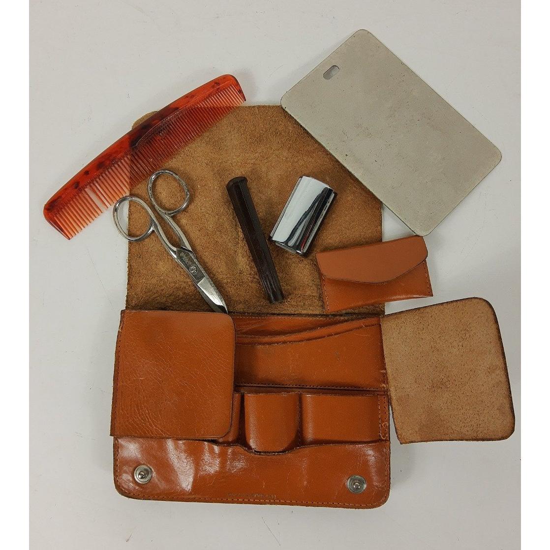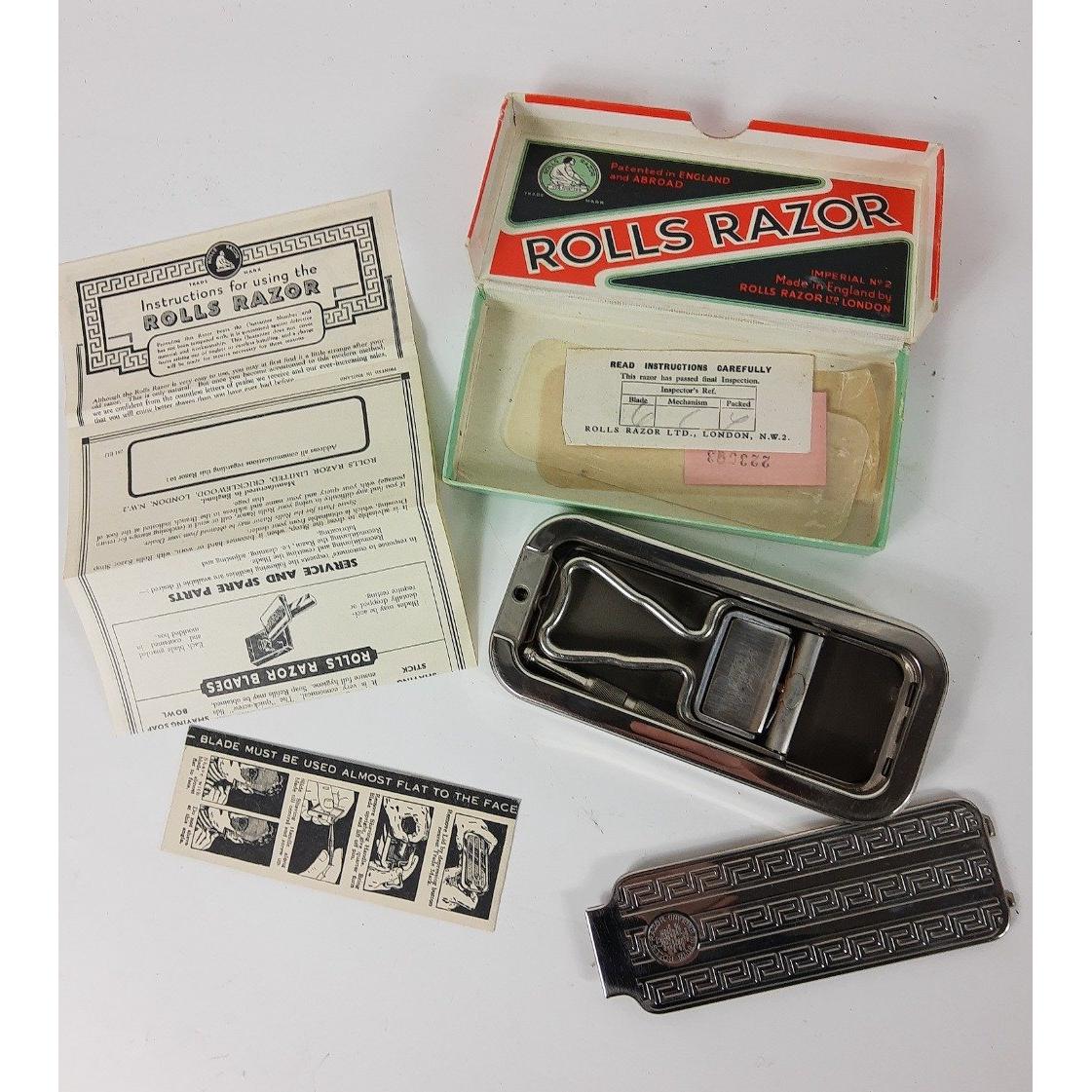 For the well-barbered gent - a vintage FAGAN Roma No 41 RAZOR STROP (61cm), a ROLLS RAZOR Imperial No. 2 in both metal and cardboard cases, a GOLDEN ERA cut-throat razor in case, a COLLINS de LUXE cut-throat razor with mother of pearl handle and case and a gent's tan leather travelling grooming case