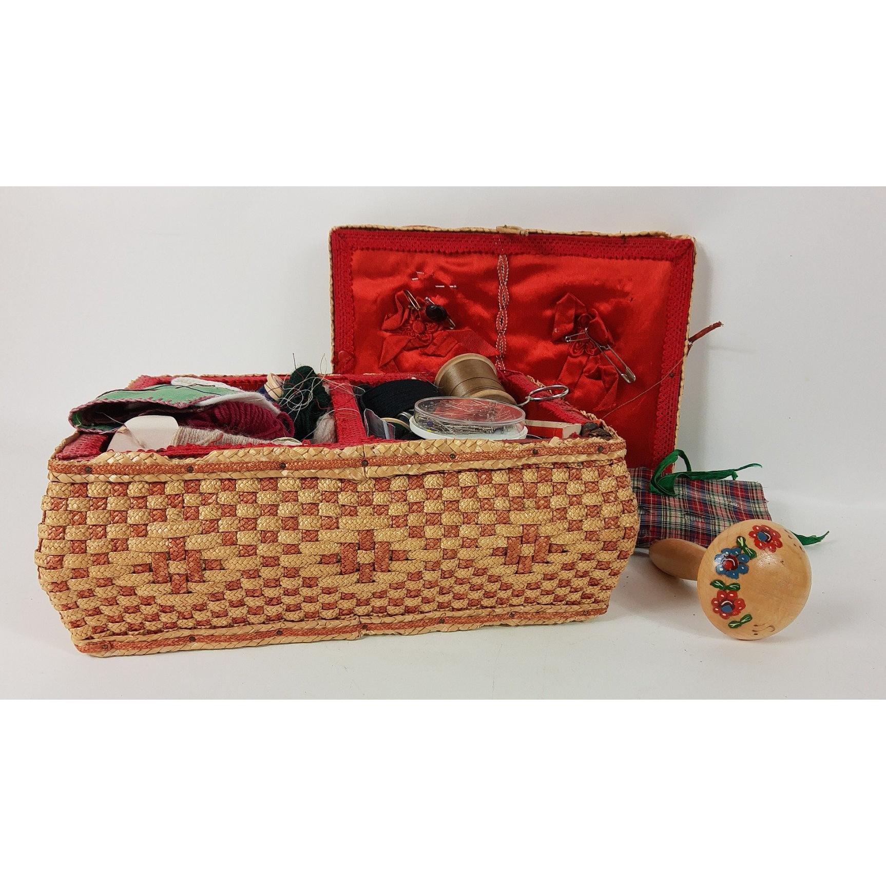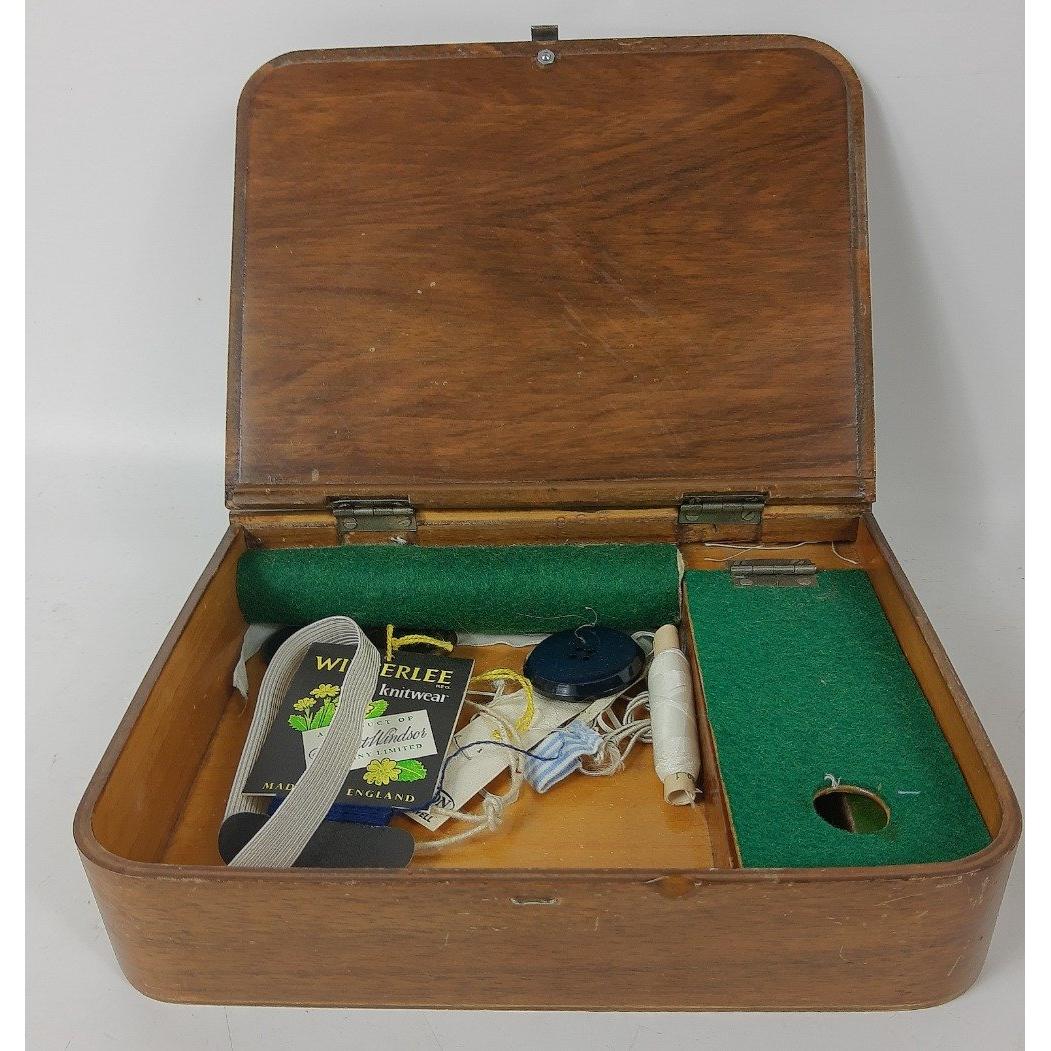 A traditional style wicker SEWING BASKET rammed full of haberdashery items including pins, threads, darning mushroom, etc, and a wooden extension box for a sewing machine 20x19x5cm with spare needles and an (old) tube of Singer lubricant for electric motors