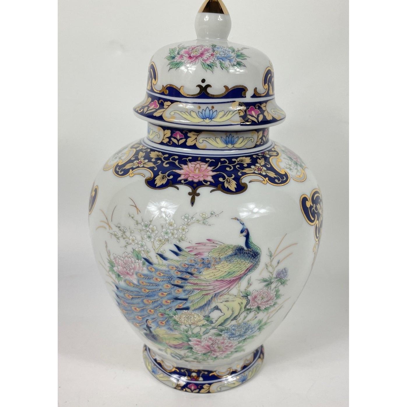 A top quality group of Japanese ceramics with a white background and a gorgeous blue peacock with iridescent gold highlights, including a ginger jar (22cm tall), a vase (21cm) and a 6 sided plate (27cm)