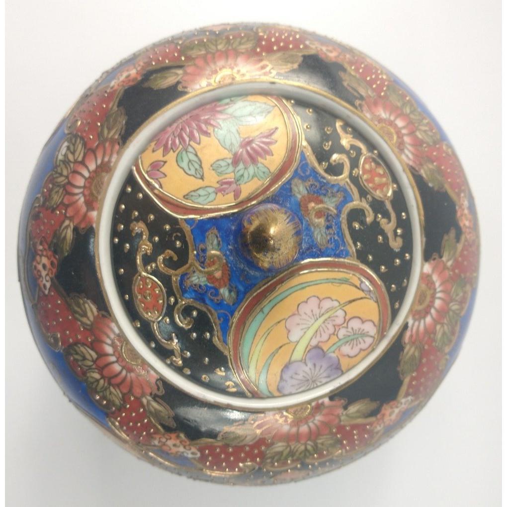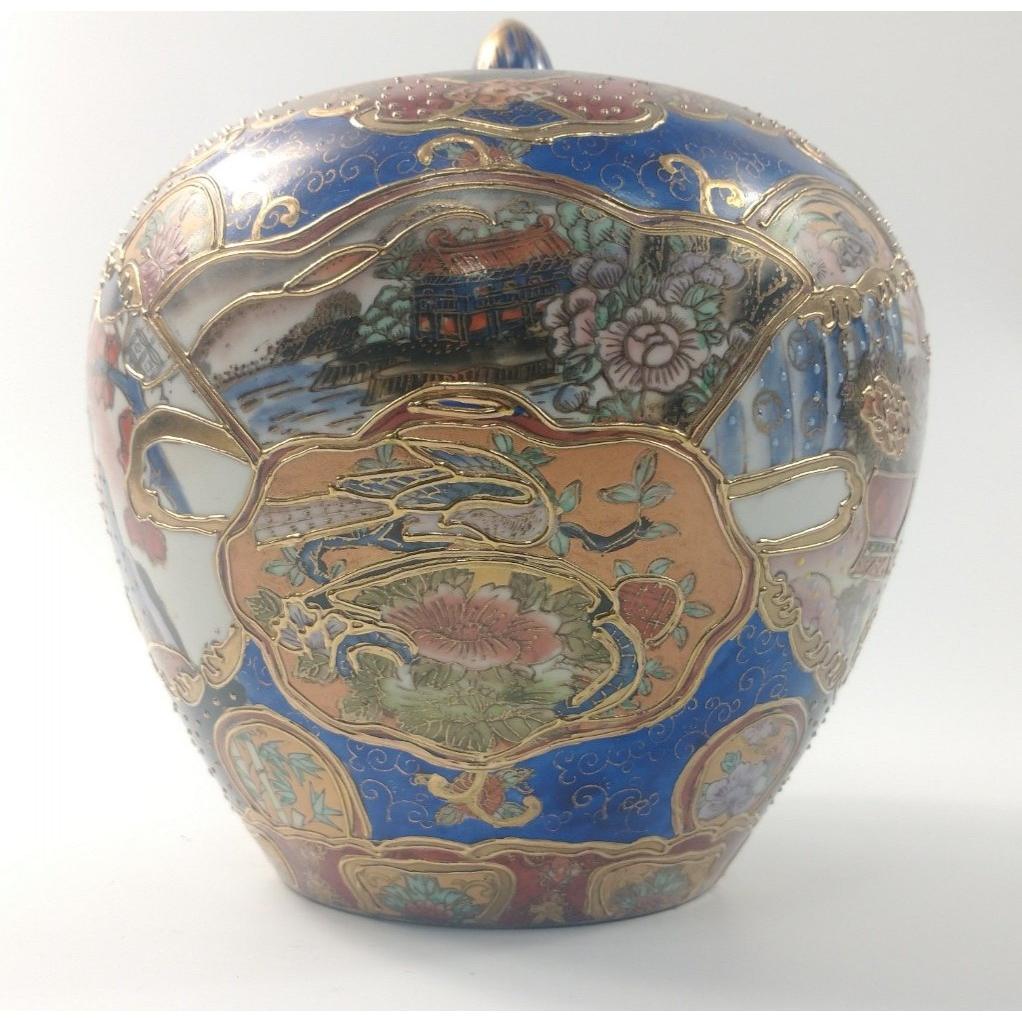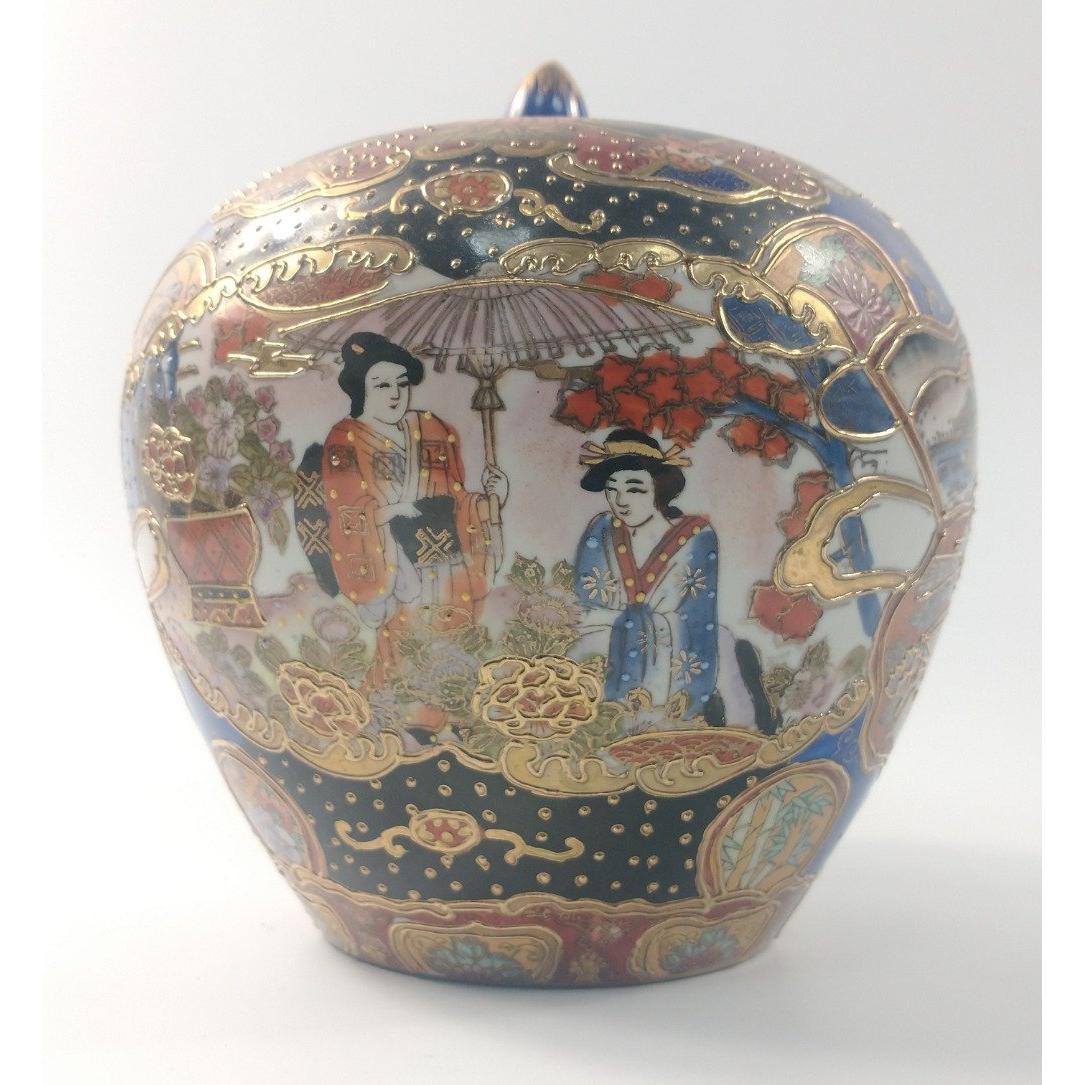 A highly decorated Oriental jar with lid decorated with court ladies and gilt highlights, stands 20cm handsApprox 1 pieces