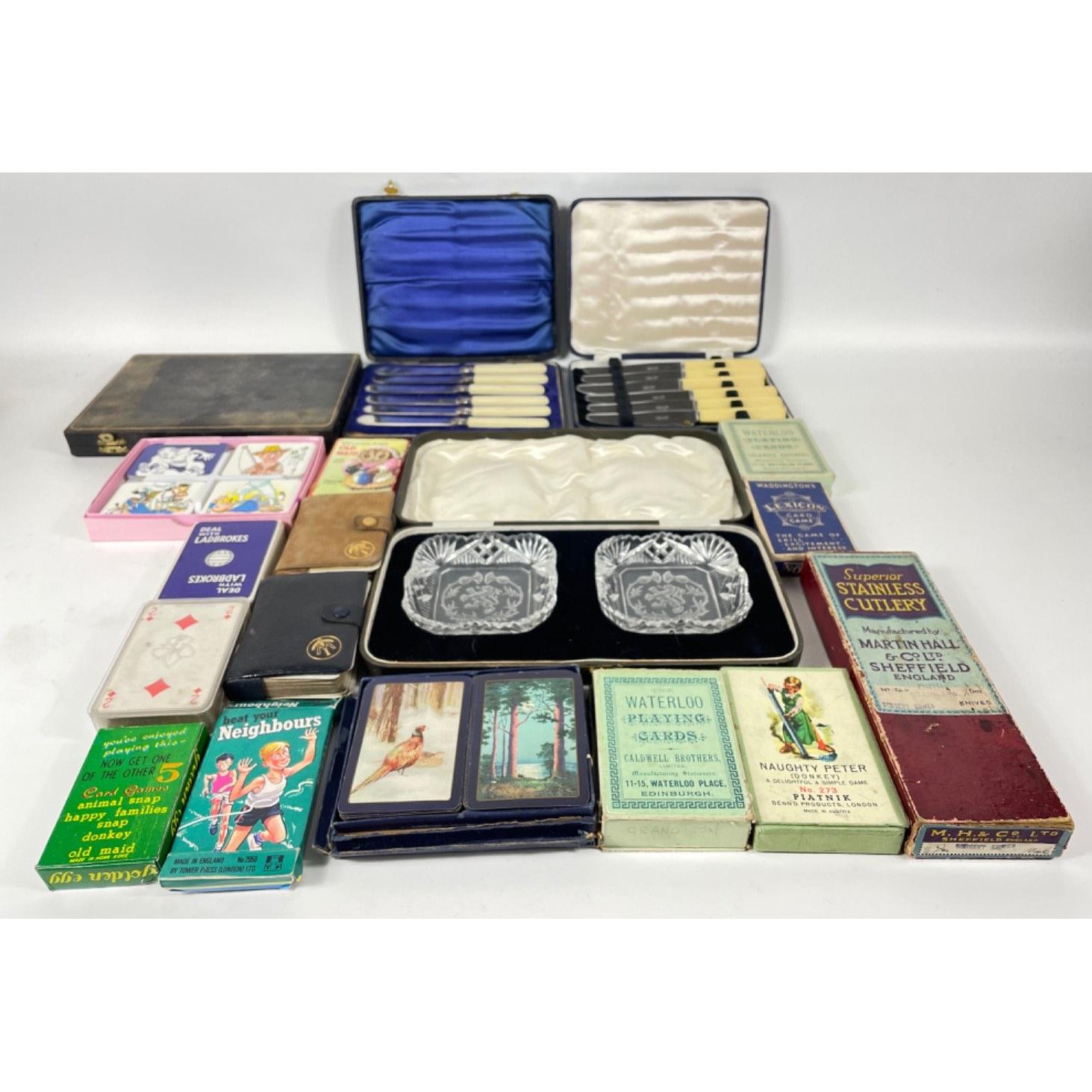 A box of 6 EPNS dessert forks, a box of six FALSTAFF PLATE grapefruit spoons and knife,a box of 6 MAPPIN & WEBB butter knives, a box with a serrated edge knife and mother of pearl handle, a box of 6 butter knives, a box of LE CLERC fish knives and forks, a box with a pair of grape scissors (other item missing), a box of MARTIN HALL & Co stainless steel dessert knives, a box with 2 Czechoslovakian cut glass dishes with a design of the lion rampant surrounded by thistles 10x10cm plus 7 empty presentation boxes for cutlery etc and a quantity of packs of playing cards - including OLD MAID