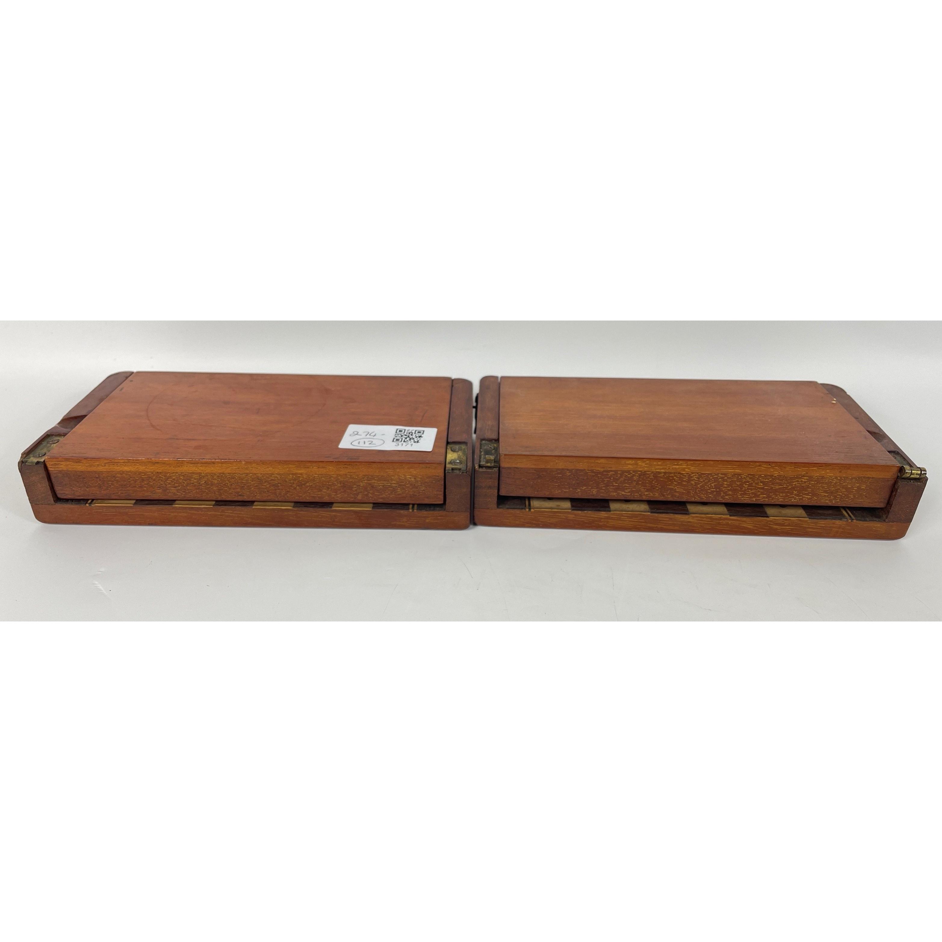 A VINTAGE complete quality handmade wooden portable chess set in 2 parts which fit together to make a board with pinholes for the chess pieces each box measures 18x9x3.5cmApprox 2 pieces