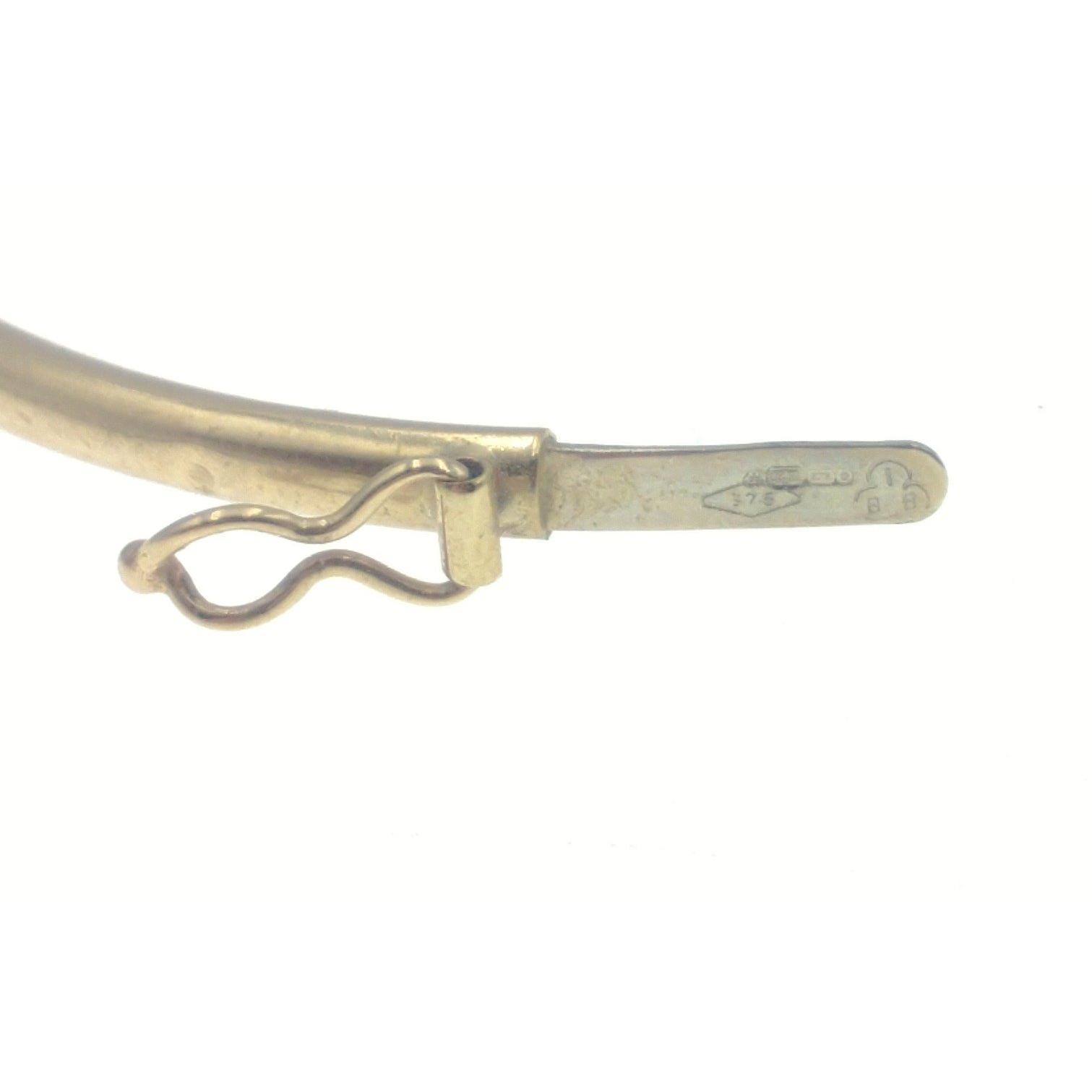 A PRETTY 375 stamped yellow gold snap-shut bangle with centred trio coloured rose, white and yellow gold decoration - weight gross 5g approx