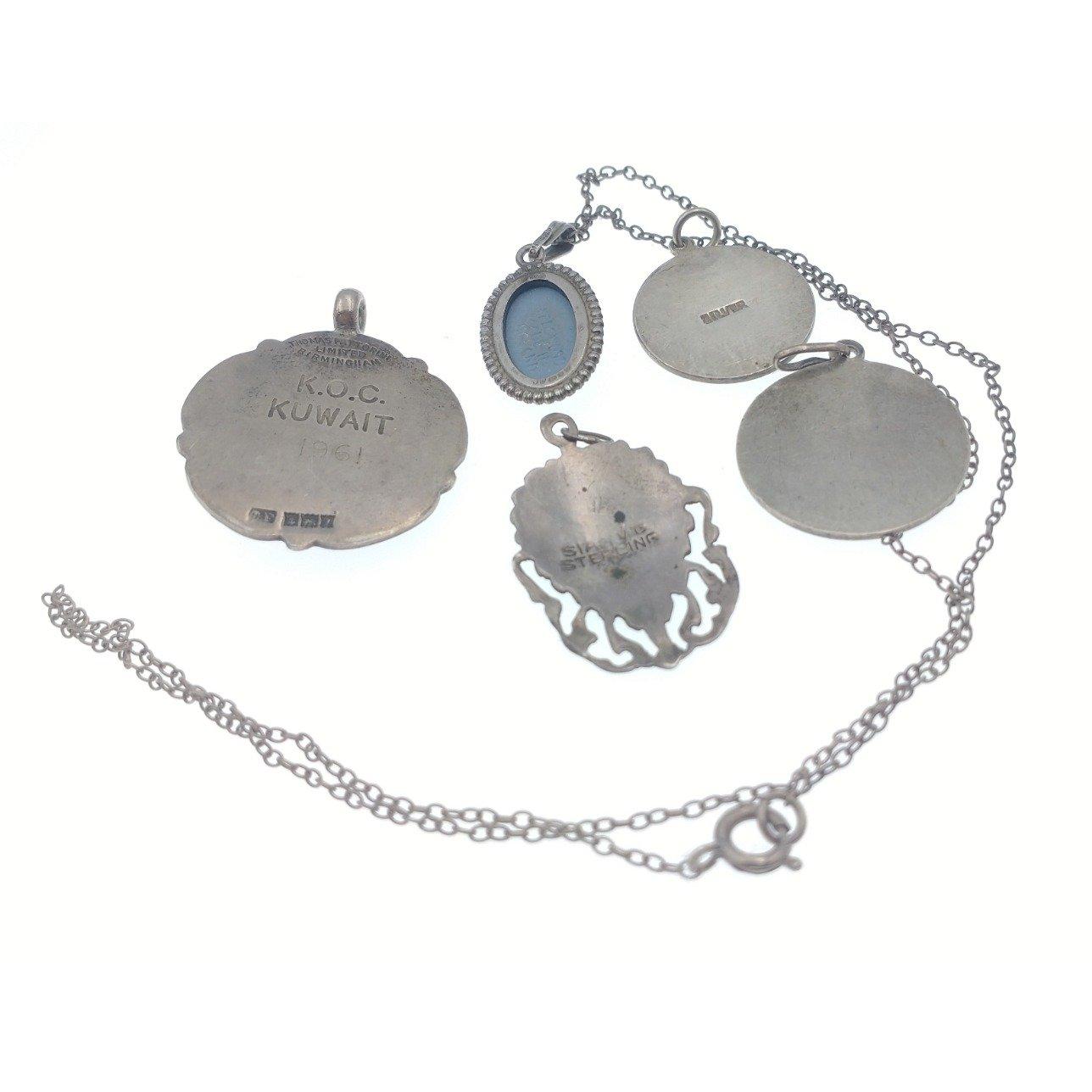 Three stamped pieces of SILVER and also a white metal pendant, three pieces of silver to include a Lion Rampant pendant 3.29g approx and also a 1961 running medal weight 8.06g approx with also a small pendant weight 1.65g gross approx and lastly a PRETTY Silver Hallmarked Cameo style Jasperware pendant gross weight 3.03g approx