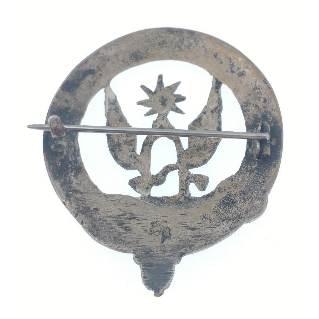 A vintage CLAN JOHNSTON BORDER REIVERSround bonnet white metal pin badge with MOTTO NUNQUAM NON PARATUS ( Translates to Never Unprepared) - dimension 4.5cm diameter approx .