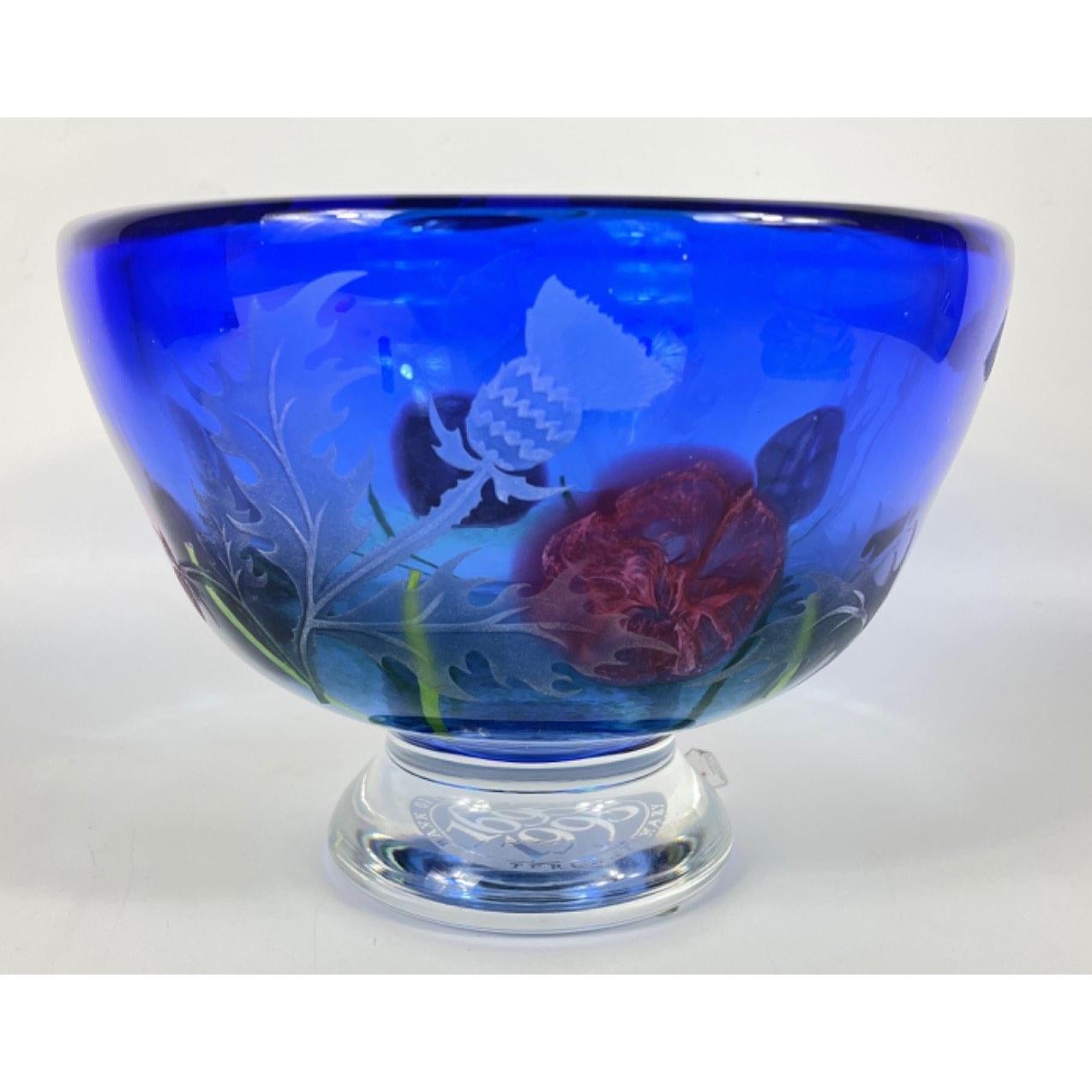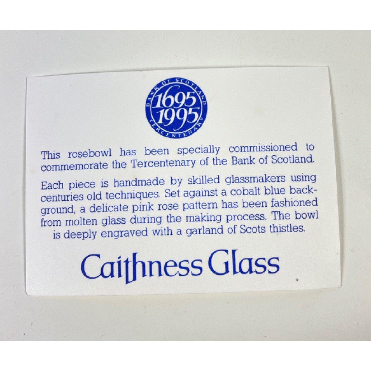 A stunning piece of CAITHNESS GLASS commissioned to celebrate the tercentenary of the Bank of Scotland stands 15cm high, diameter21cm. Further info: Each piece is handmade by skilled glassmakers using centuries old techniques. Set against a cobalt blue background, a delicate pink rose pattern has been fashioned from molten glass during the making process. The bowl is deeply engraved with a garland of Scots thistles. Comes in original lined and padded presentation box