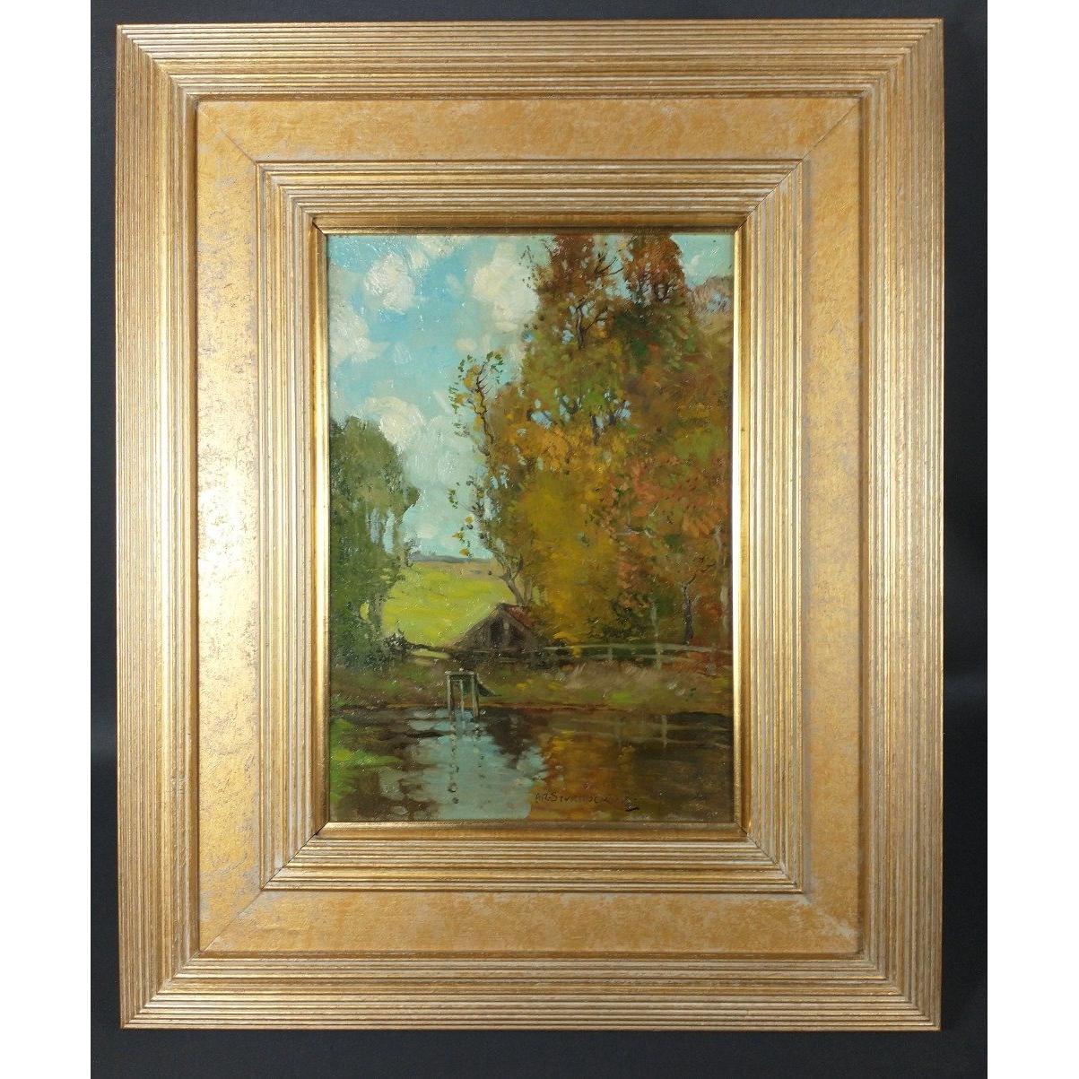 ALICK RIDDEL STURROCK 'By The Waterside' oil on board, signed and dated July 1913 - dimensions 15" x 10" (Scottish b1885 - d1953) - within a modern stylish distress-look frame