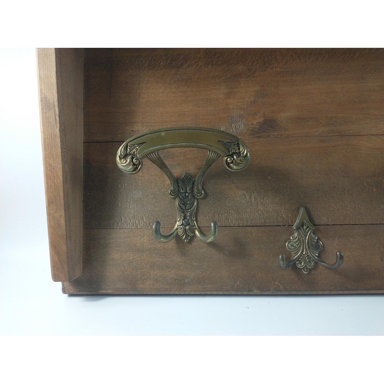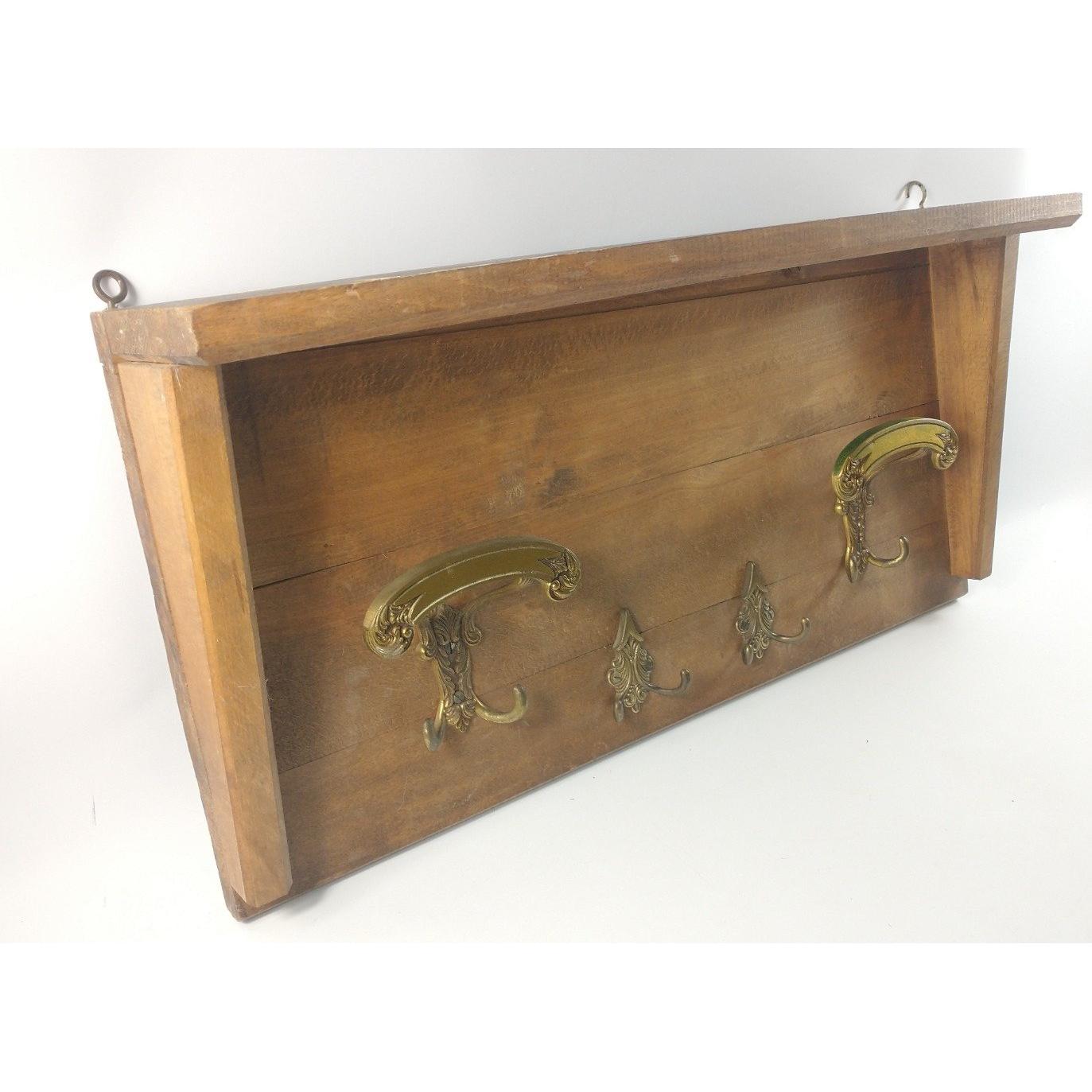 A SUBSTANTIAL wall mounted carpenter-fashioned rustic wooden hat rack - dimensions 70cm long x 34cm height with sturdy brass hooks Approx 1 pieces