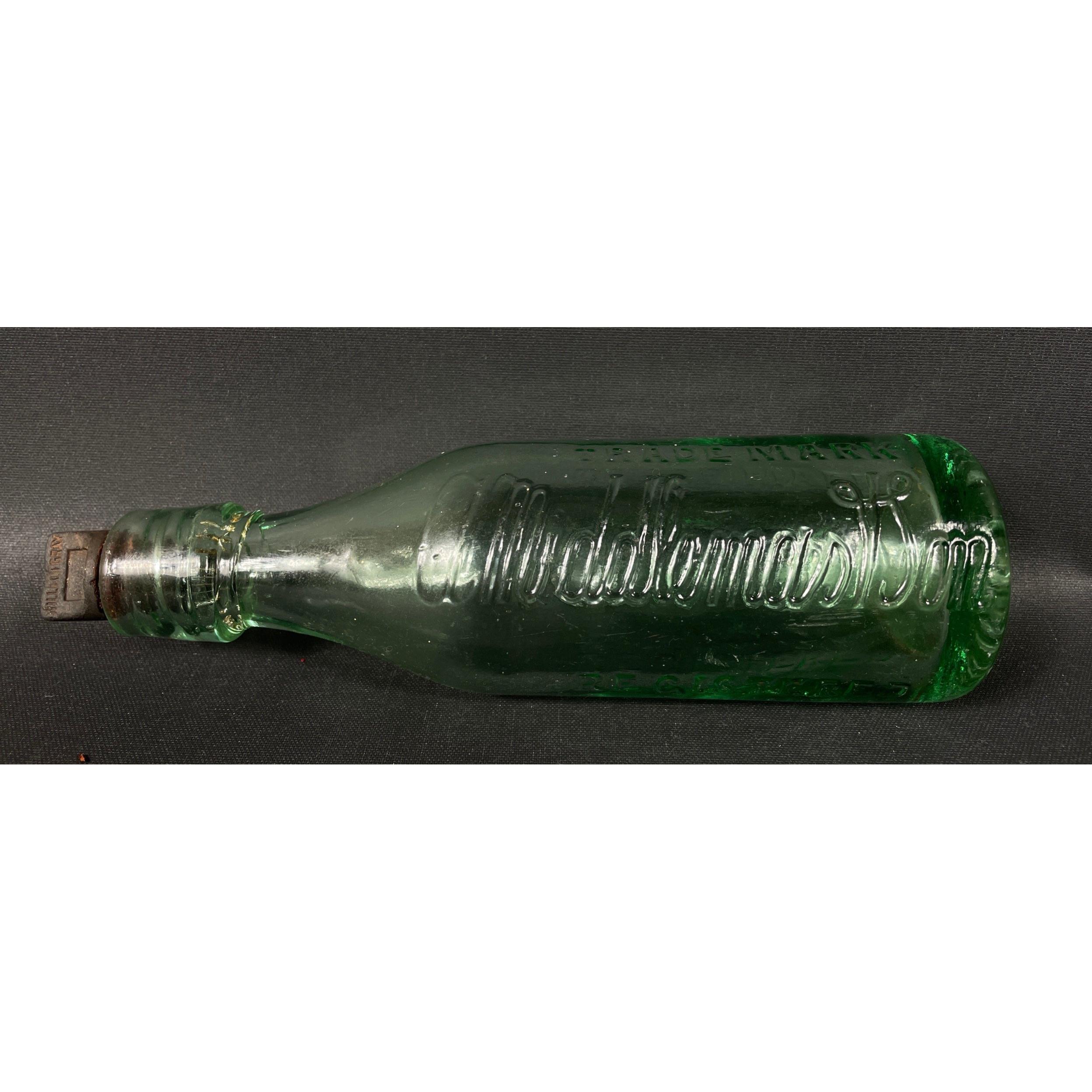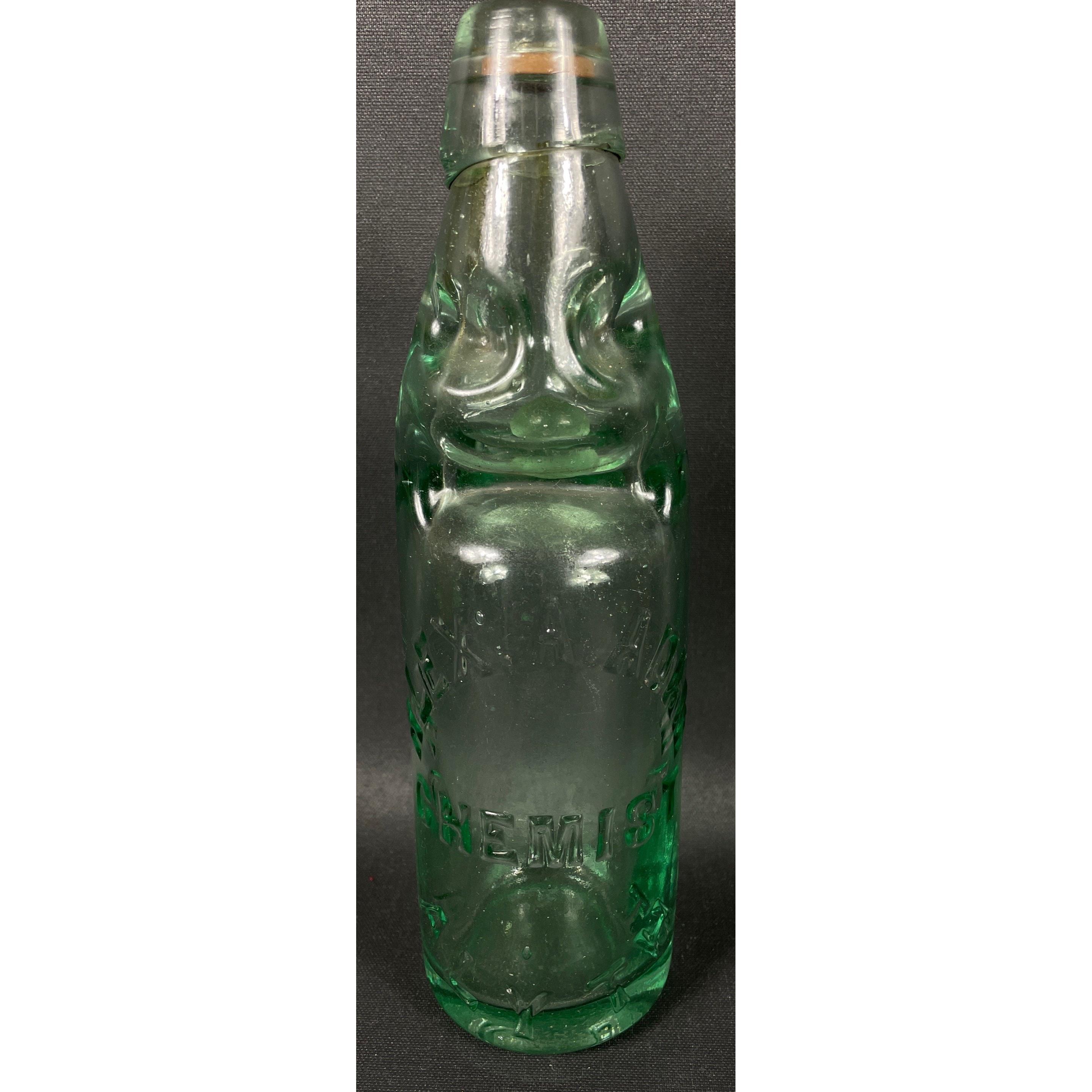 A collection of vintage glass bottles to include 3 with marble stoppers from 'Alex A Adam, Chemist, Alyth', 'H Muir West Shaw St, Kilmarnock', 'JB Grieve, Carlisle', 3 bottles with screw tops from Leitch, Edinburgh', 'A Middlemas & Son, Kelso', 'James Dunbar, Albion St, Edinburgh, one unstoppered bottle from 'Wm Petrie Ltd, Leith' and a small green medicine bottle with a 'Not to be taken - Carbon Tetrachloride' label