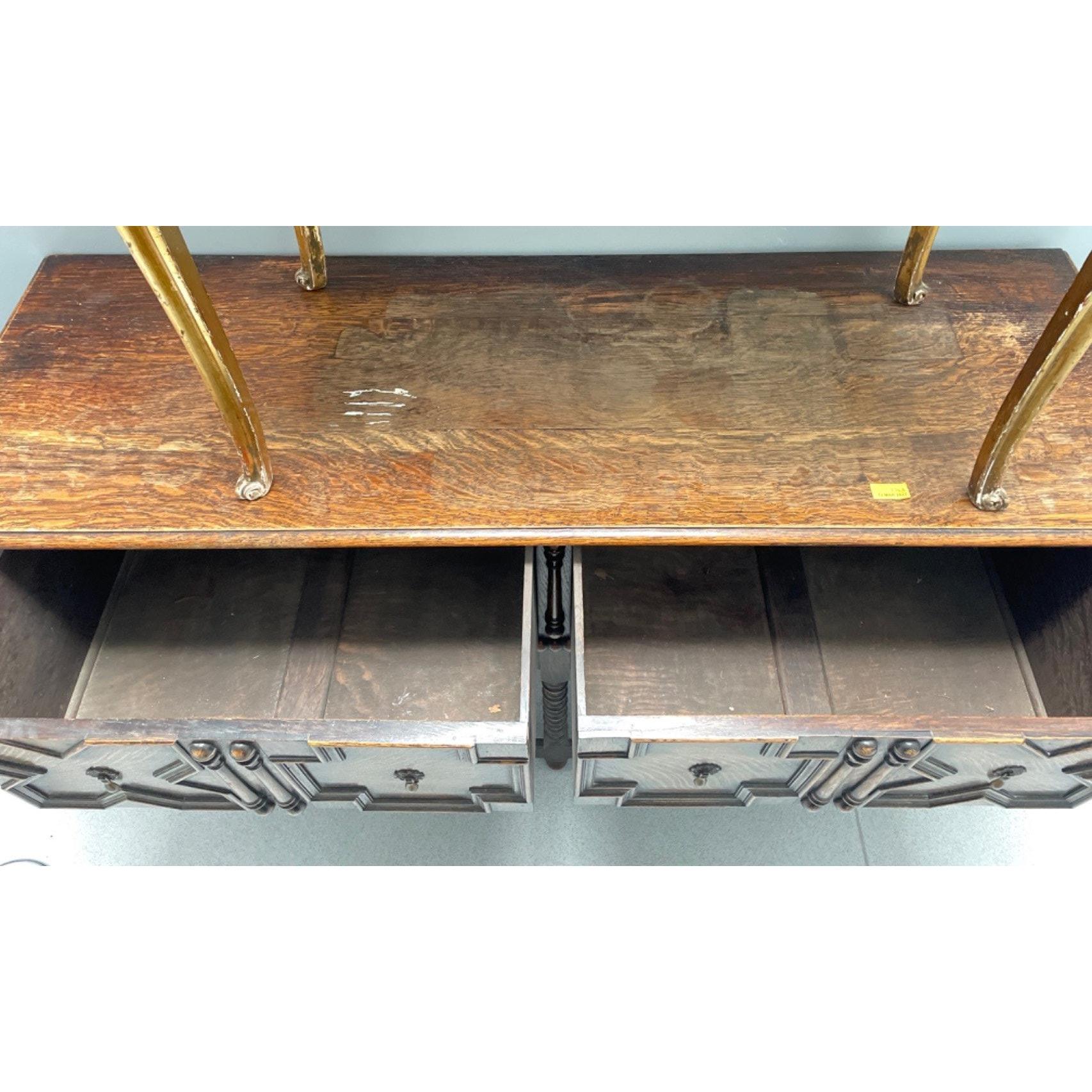 An ANTIQUE OAK STRETCHERED cabinet with two DEEP carved panelled drawers -and barley twist front supports 4.5ft long x 48cm deep x 88cm height approx