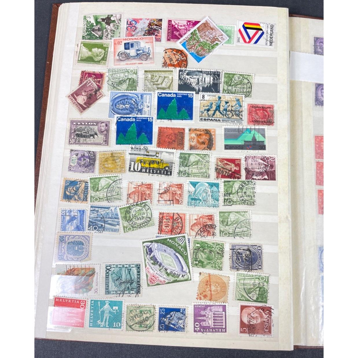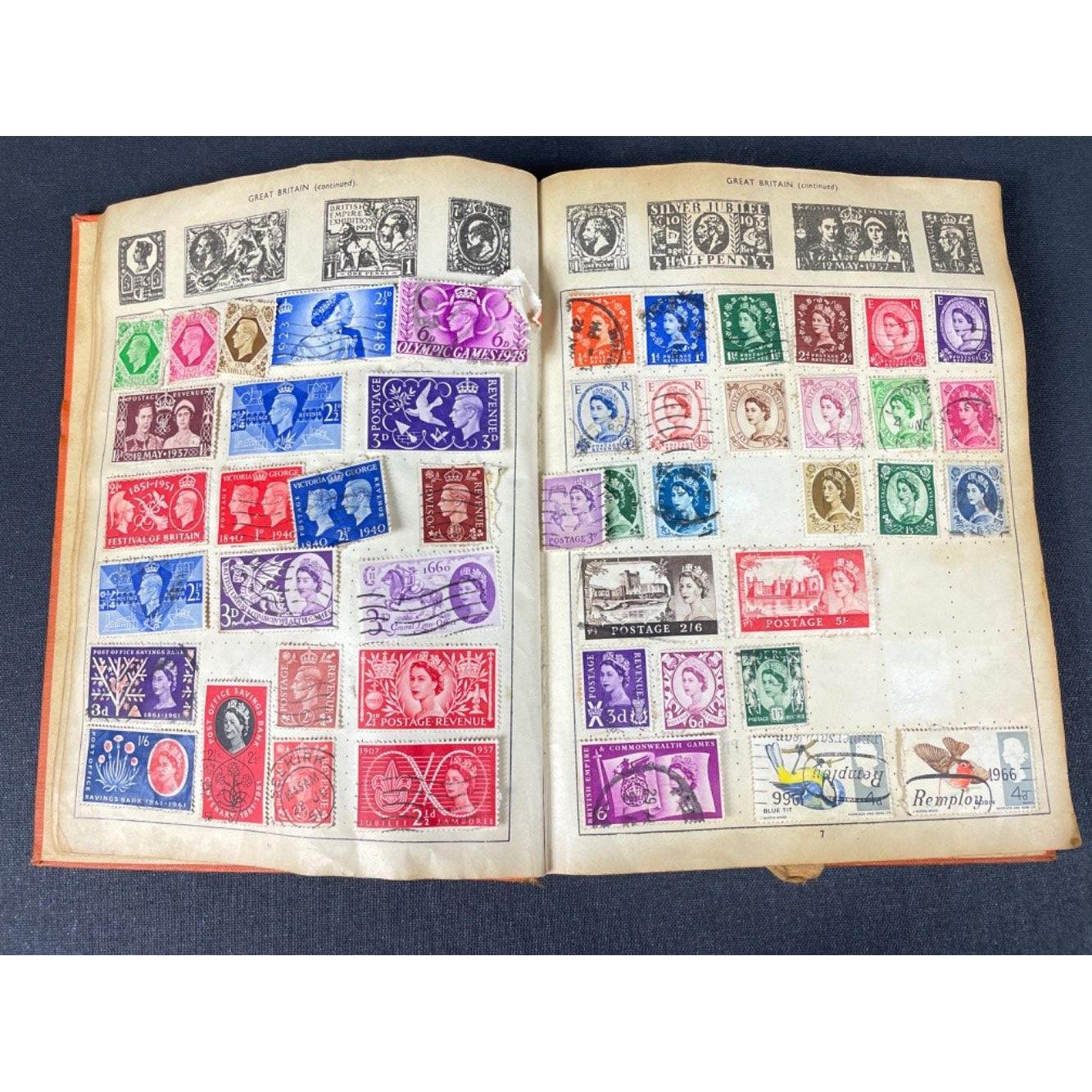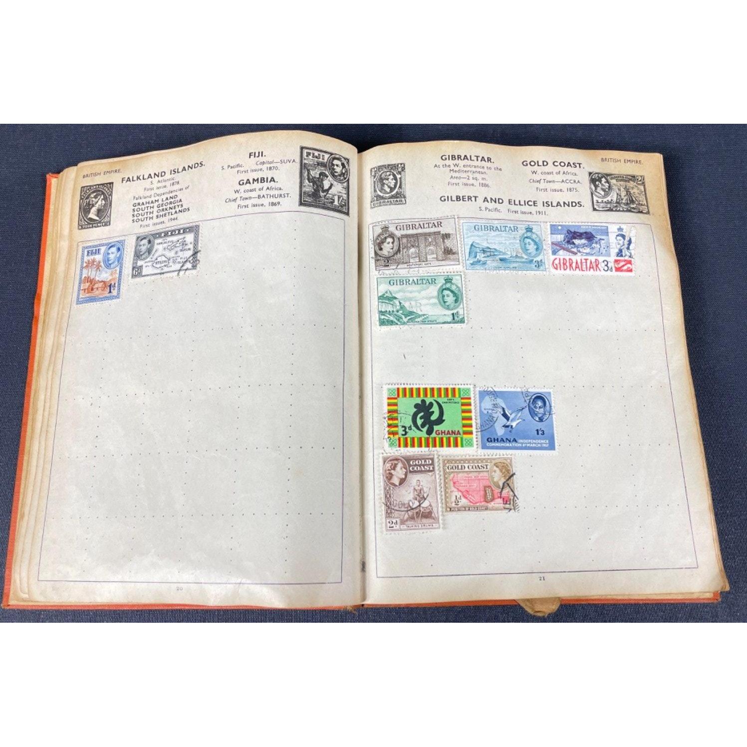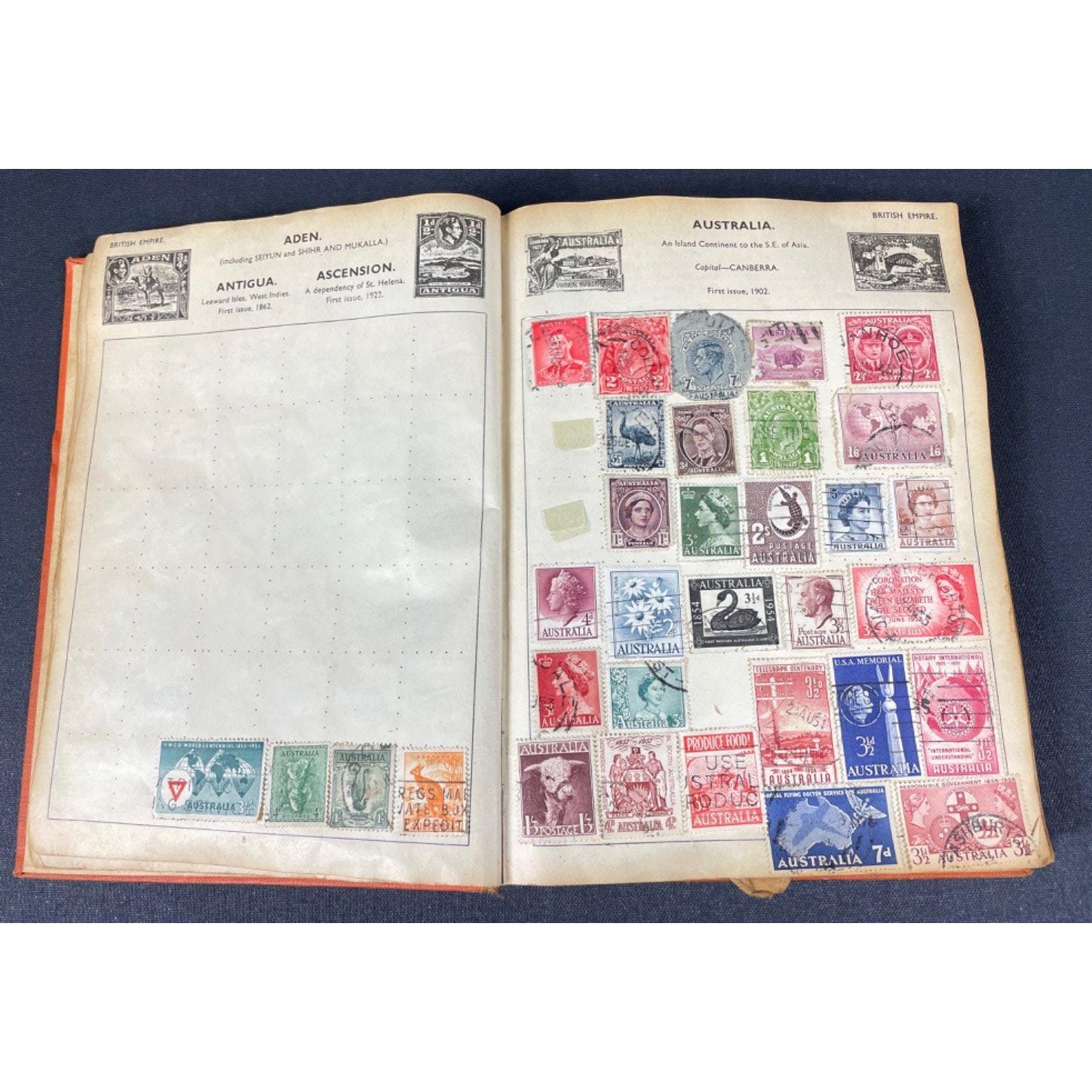 A collection of two stamp albums(brown and light brown covers) to include British Queen Elizabeth early reign stamps c50's and 60's also for Canada, Australia, Portugal, Spain, Eire, Italy France, World Colonies and World stamps