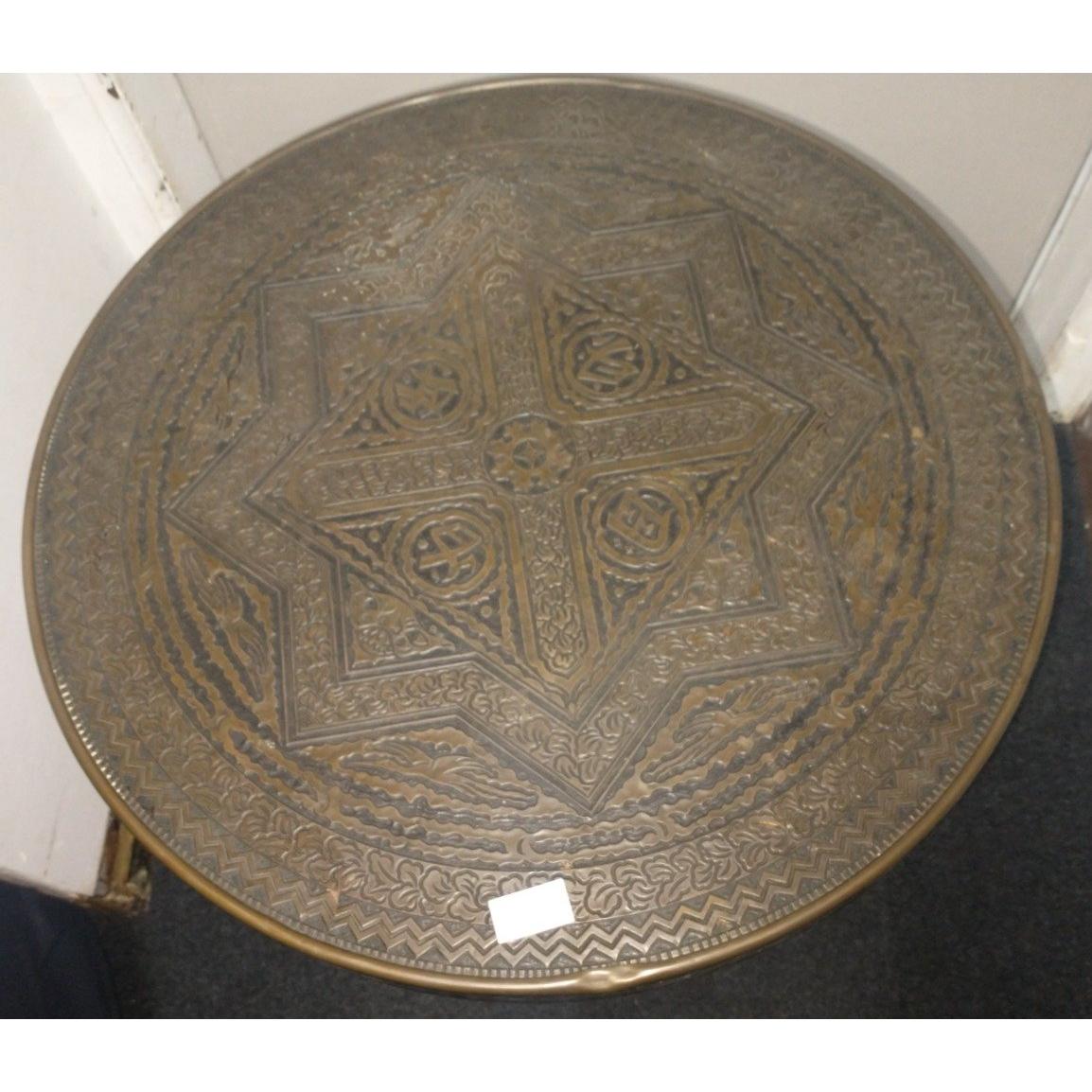 A brass topped BENARES table( (which folds away) diameter 60cm x height 58cm approxApprox 2 pieces