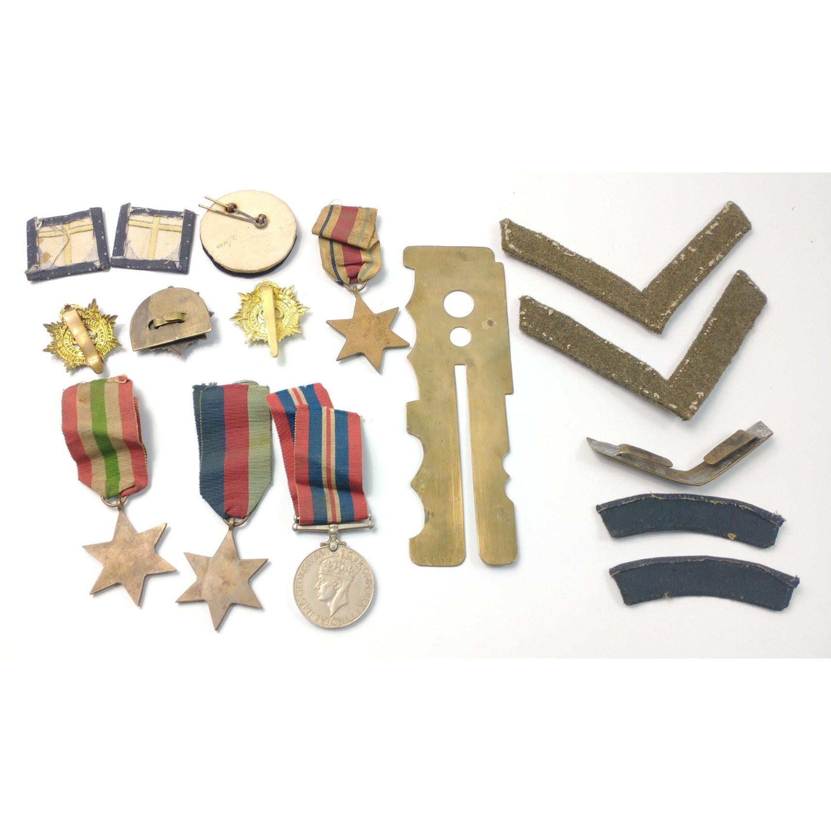A collection of WWII service medals with ribbons to include THE AFRICA STAR, THE ITALY STAR, THE 1939-45 STAR and THE WAR MEDAL plus a number of RASC cap badges etc