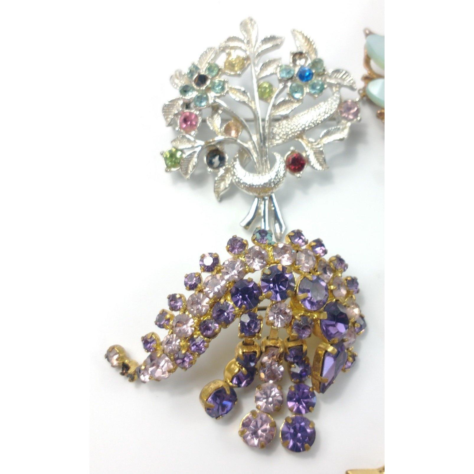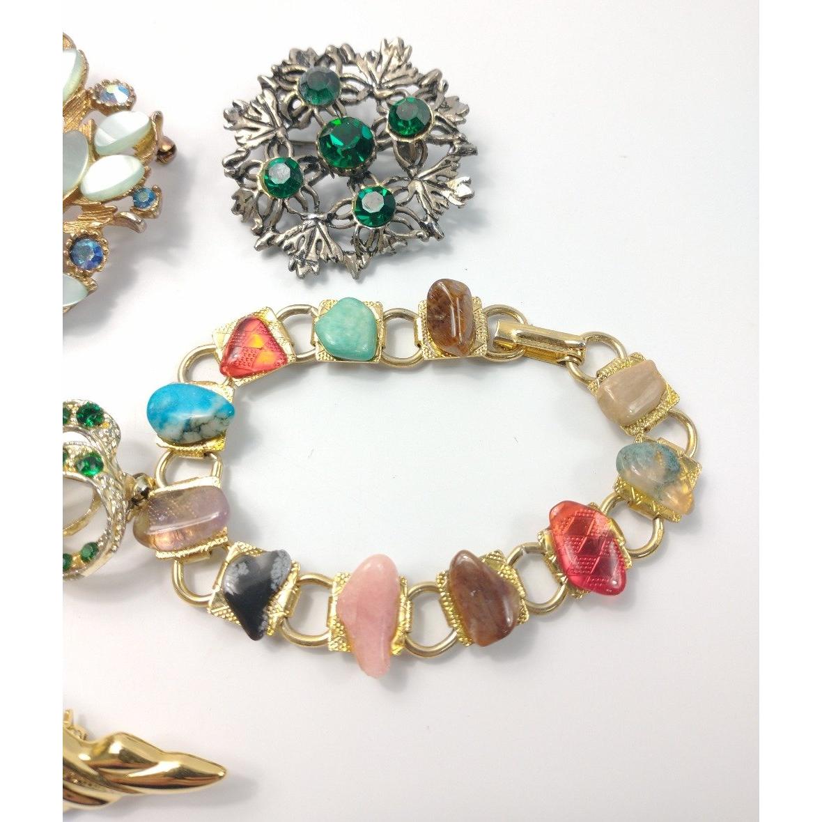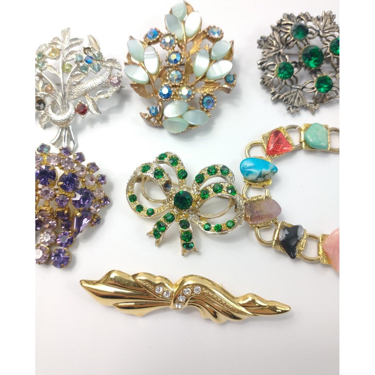 Seven pieces of costume jewellery to include 6 different stoned brooches and a multi-coloured stoned braceletApprox 7 pieces