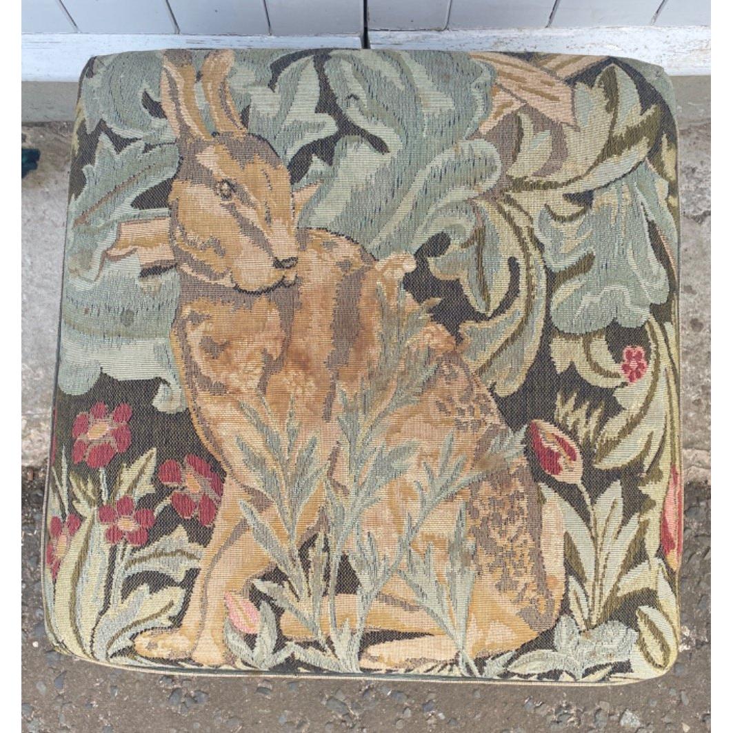 Tapestry style topped square footstool with Queen Anne style legs and rabbit design W: 43cm approx H: 35cm approx