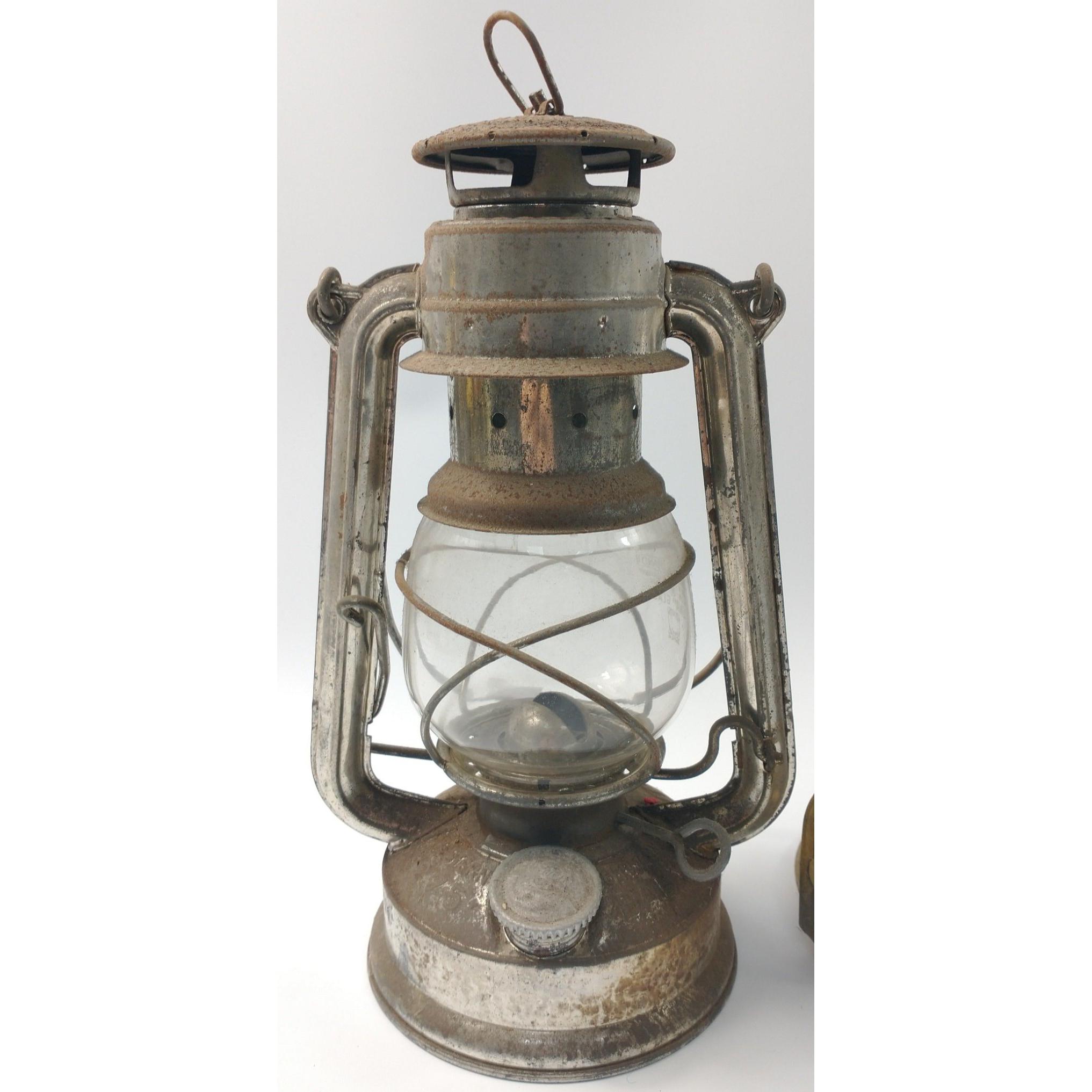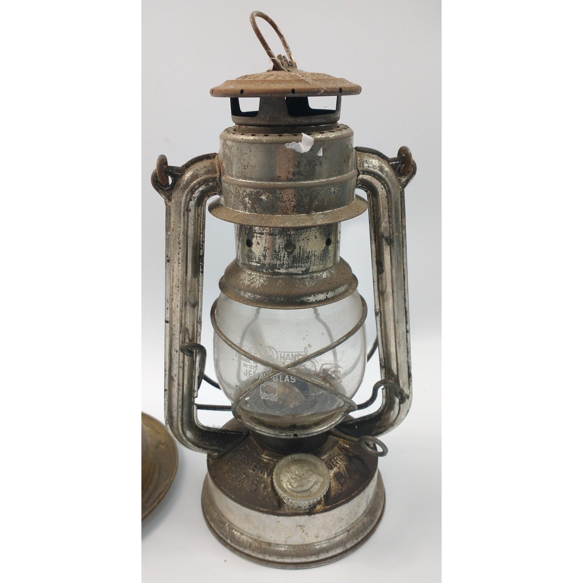 A pair of vintage German FEUERHAND 275 storm lamps (24cm tall) and a metal oil lamp which can be wall-mounted (27cm tall)Approx 3 pieces