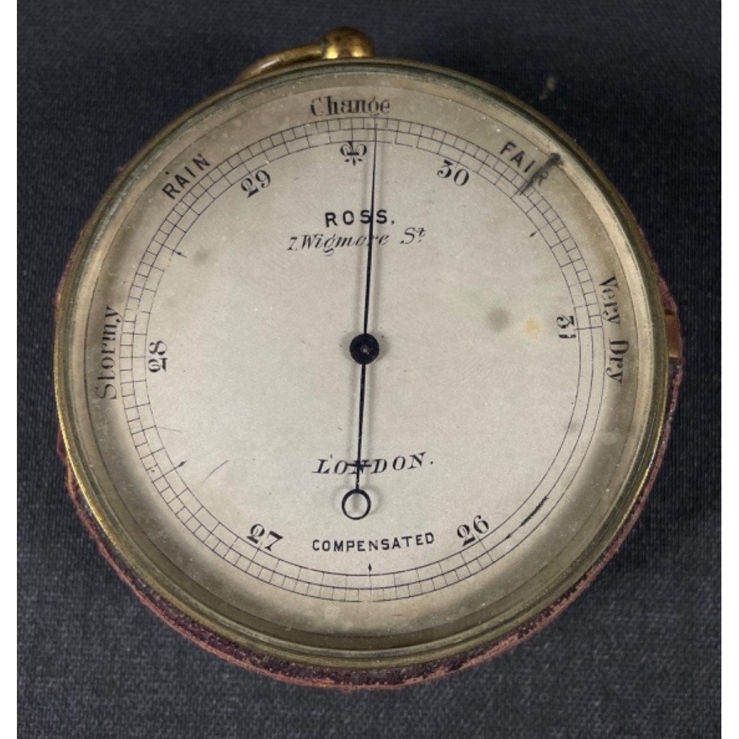 An antique compensated POCKET BAROMETER by Ross of Wigmore St, London comes in original leather case, glass face is intact 7cm dia, overall in good conditionApprox 1 pieces