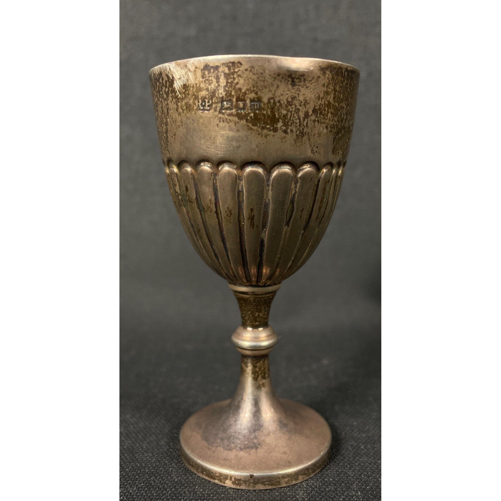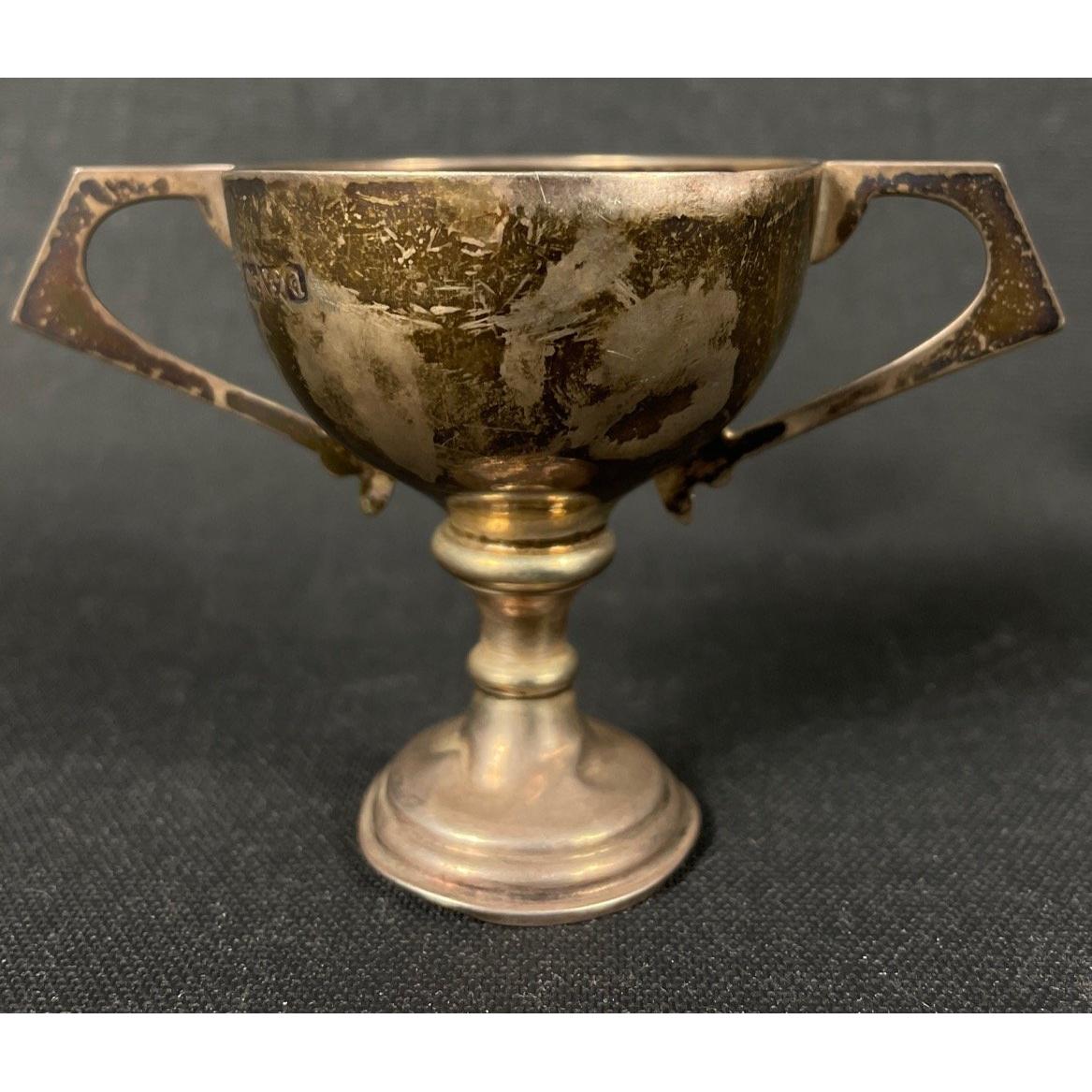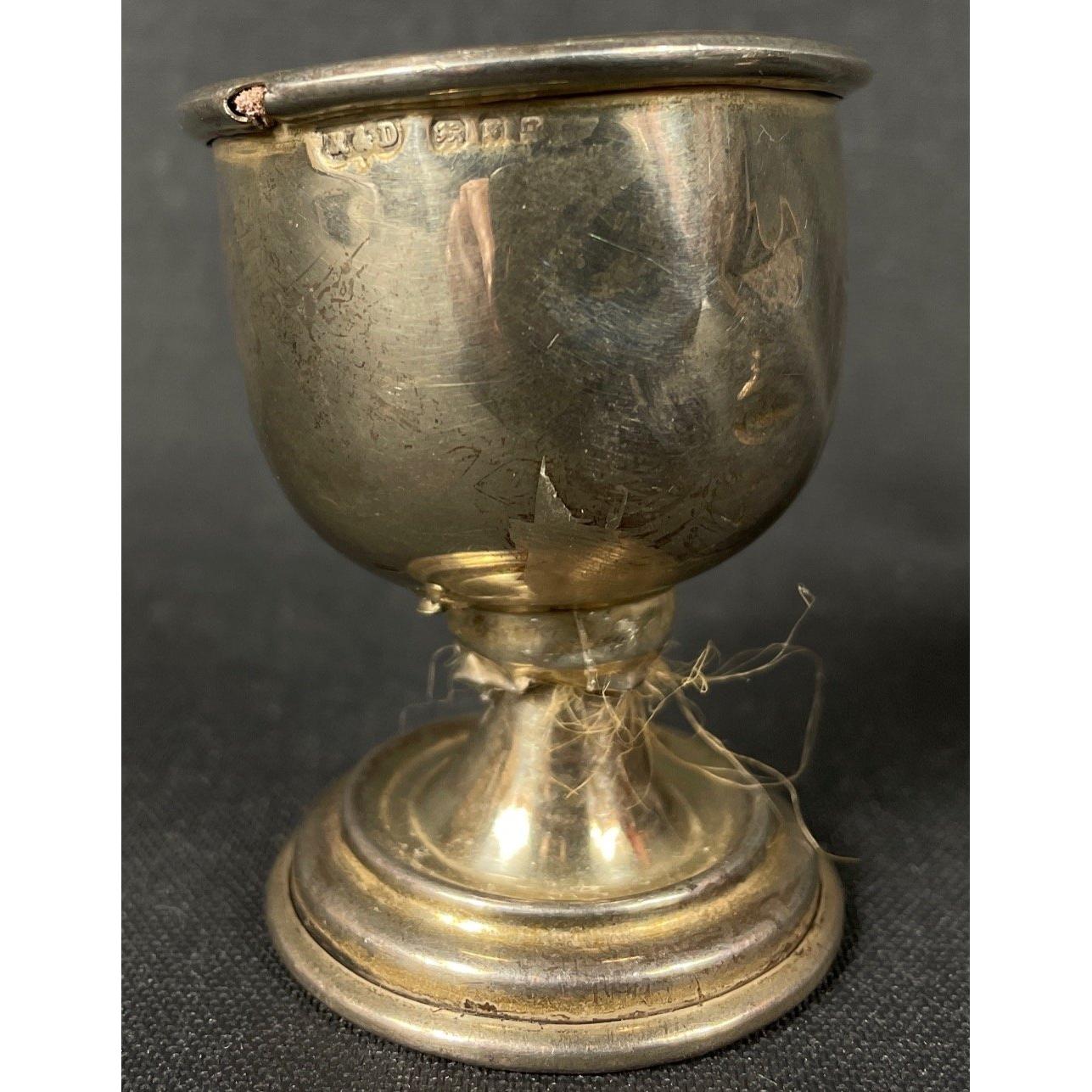 Three small silver hallmarked cups (tallest being 8cm), the first - Chester 1926, weight 29g, the second possible Chester 1875, weight 18gm, and the third (AF) unclear assay marks weight 20g