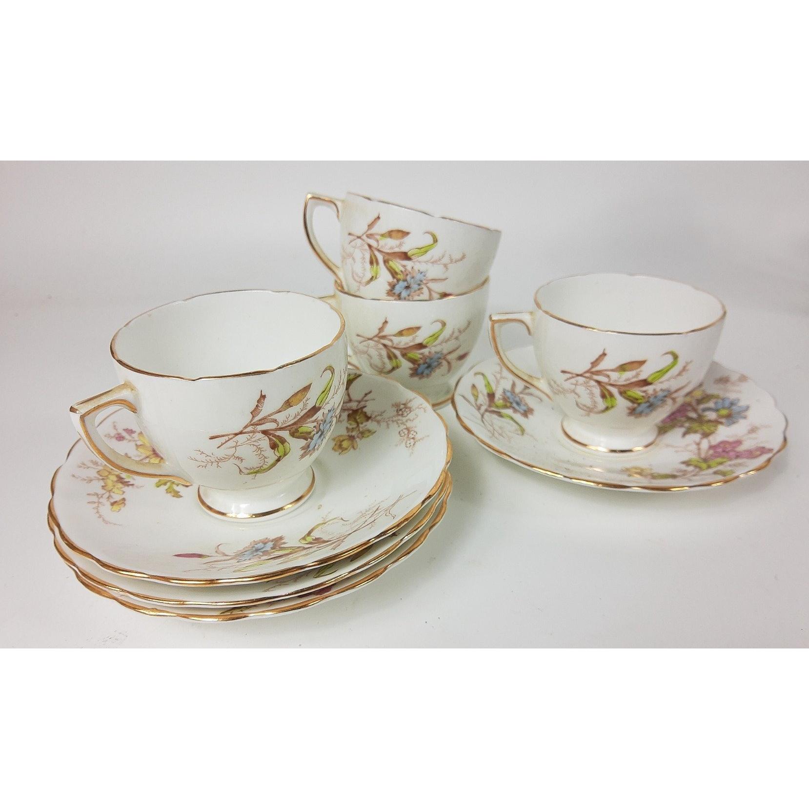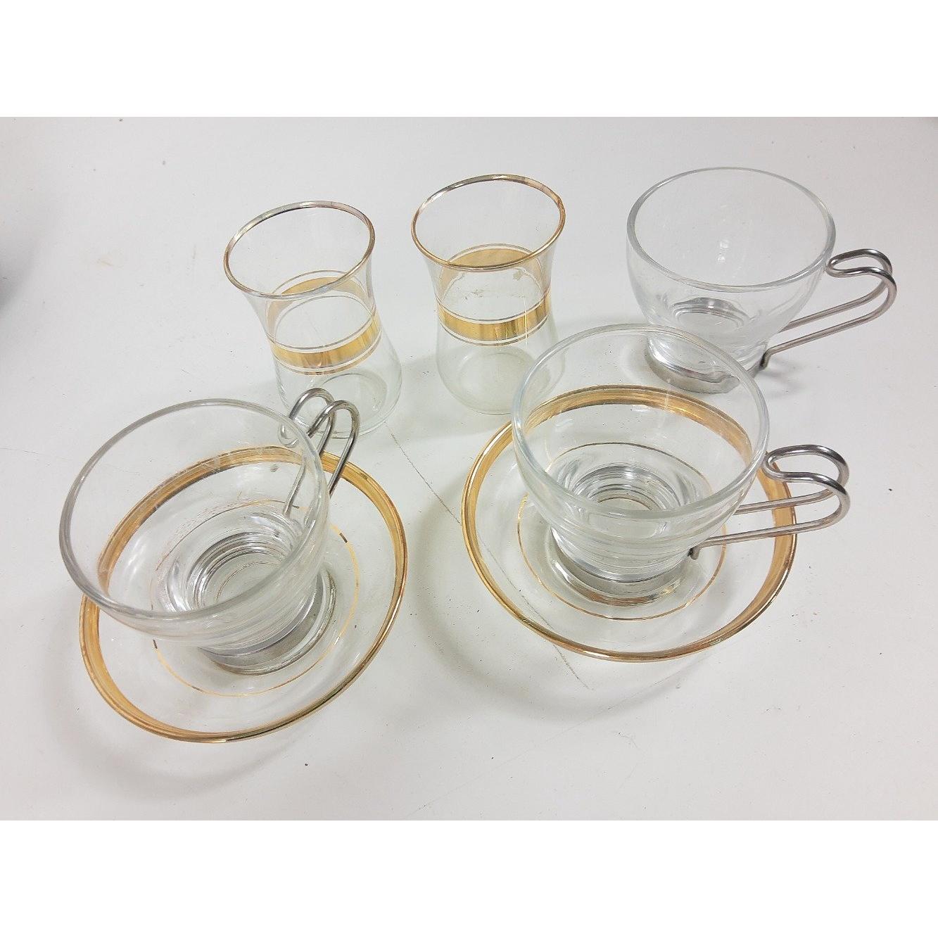 An international lot for tea and coffee drinkers to include 8 French APILCO bistro cups in green with gold rim plus 8 saucers and a creamer all from the traditional French porcelain factory of Deshoulières, 3 clear glass espresso cups with metal handles from Italy, 2 Middle Eastern tea cups and saucers and 4 English ROSINA demi-tasse cups and saucers