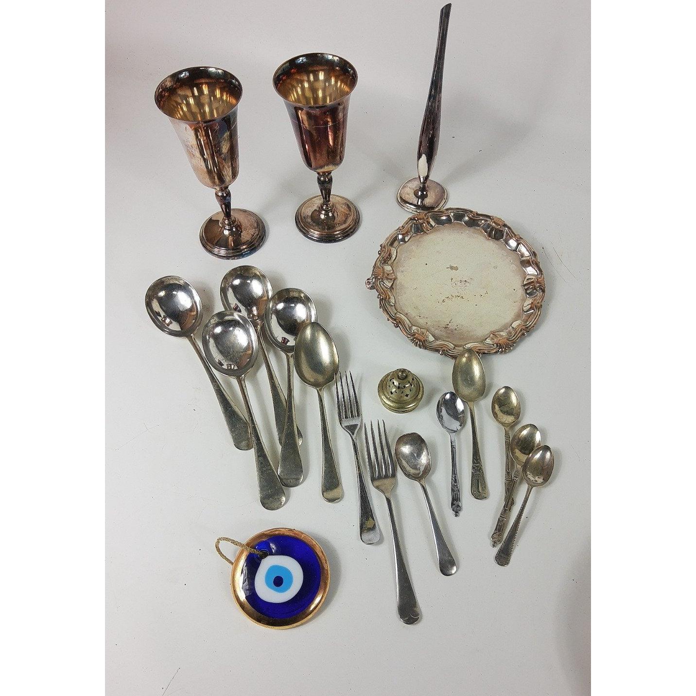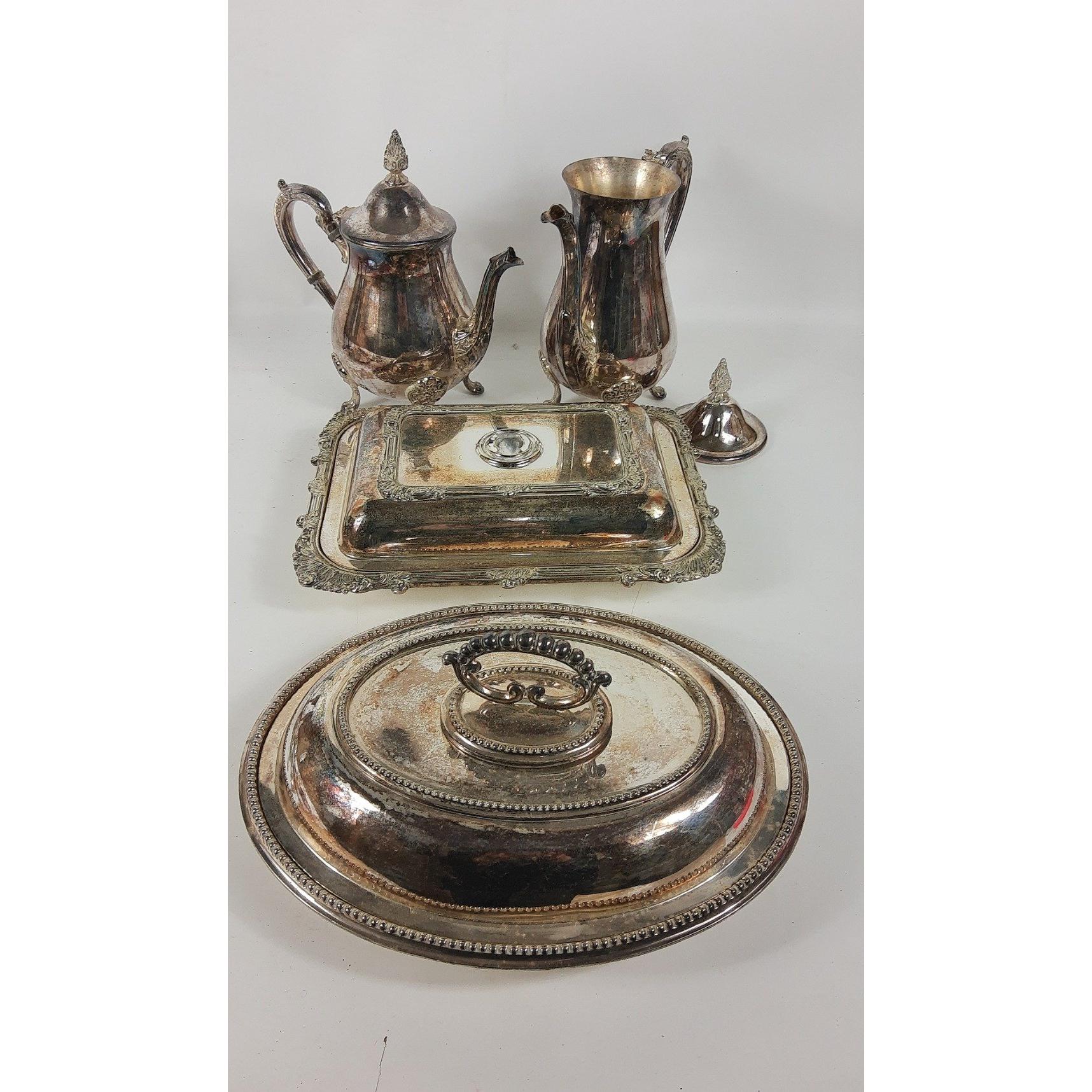 A MAPPIN BROTHERS white metal serving dish (30cm long), a VINER'S silver plate teapot (25cm high) and matching coffee pot (29cm high, lid hinge needs repair), a lidded serving dish (30cm long), 2 goblets and a small salver missing one leg (17cm dia)