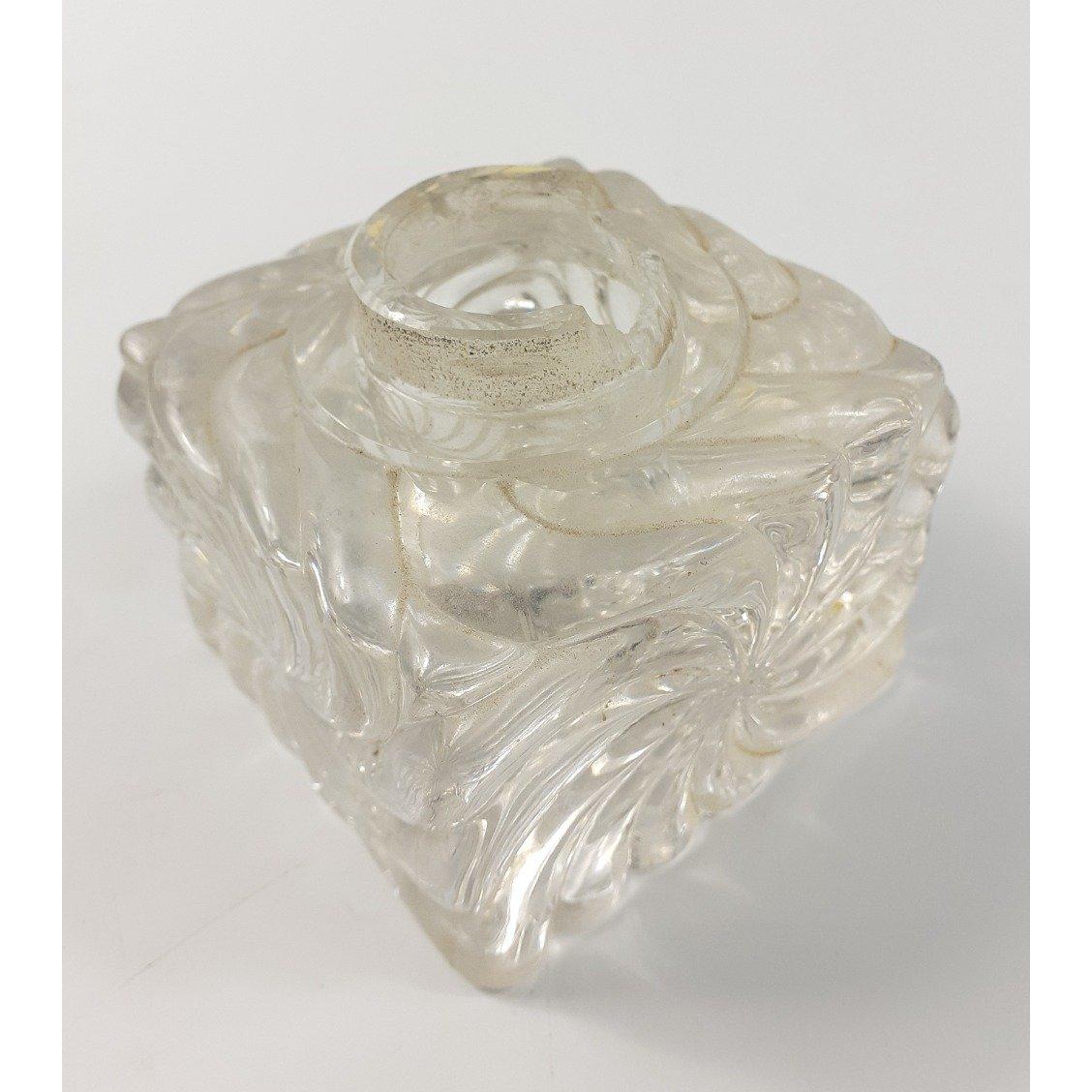 A large, vintage glass inkwell on a brass base with perpetual calendar 17x17x14cmH, some damage to lip of inkwell but covered by the brass sconceApprox 1 pieces