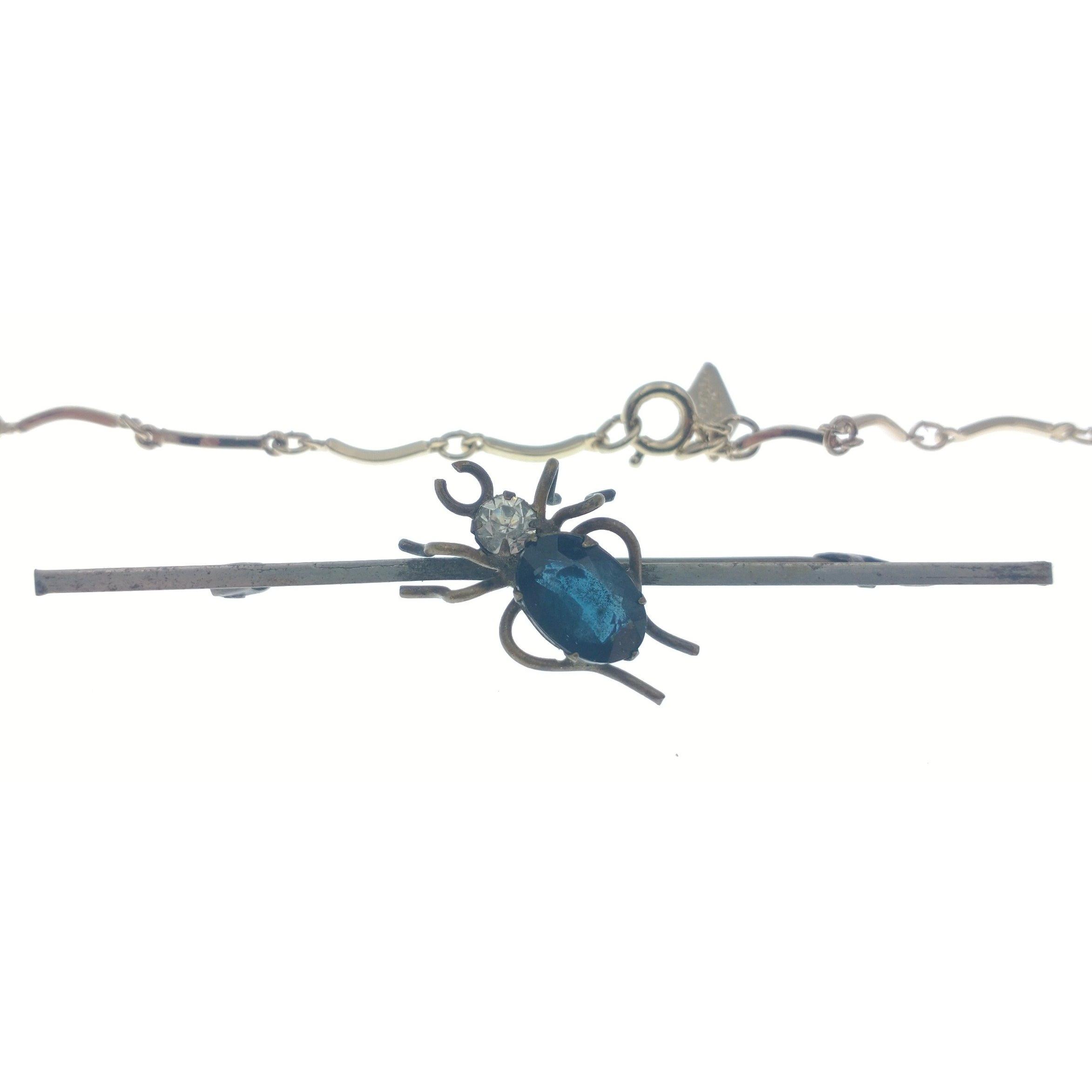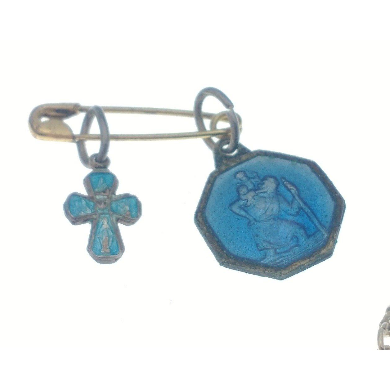 A white metal bar brooch with purple and white stone bug, yellow metal necklace with 5 pearl-style drops, a small blue St Christopher and blue cross gross weight 10g