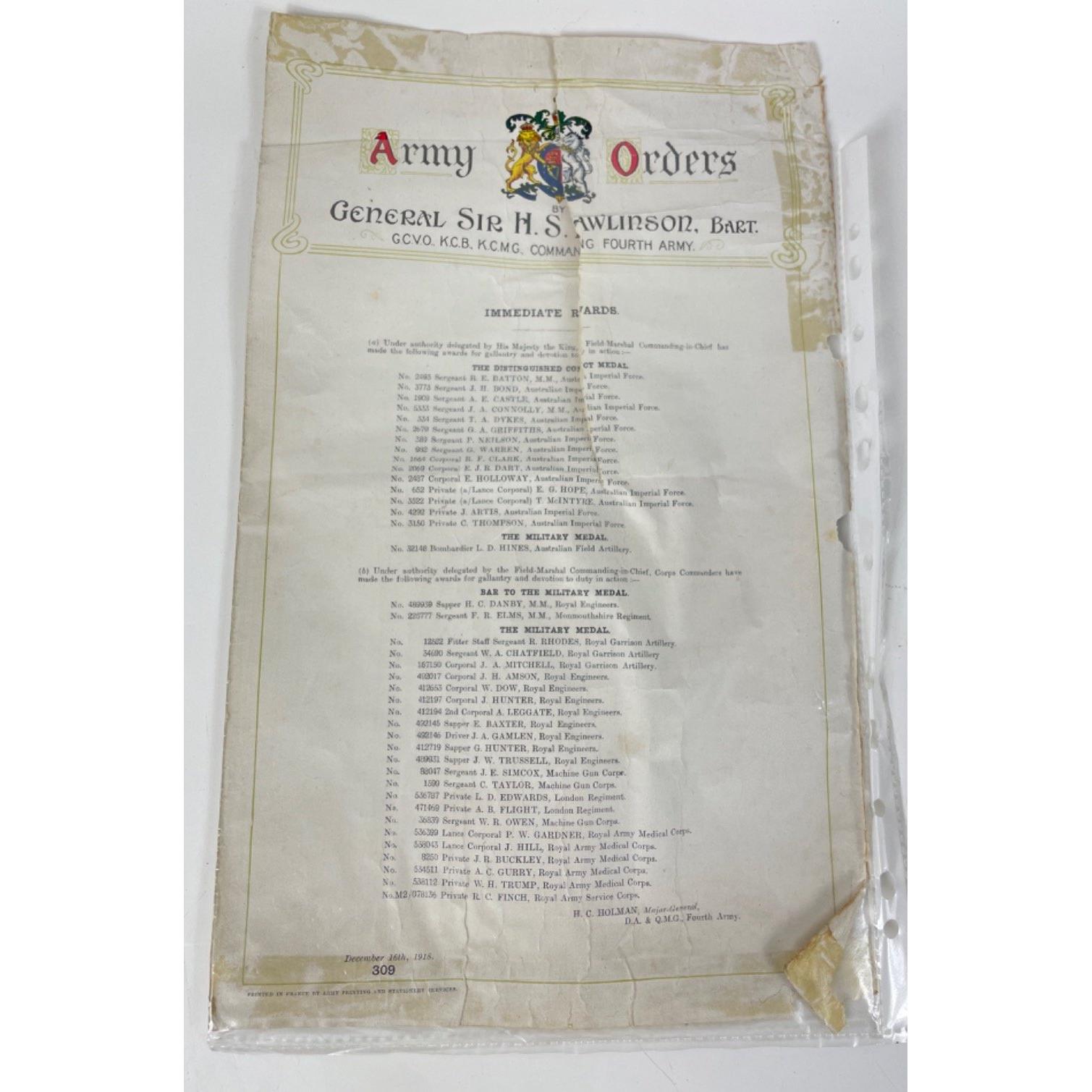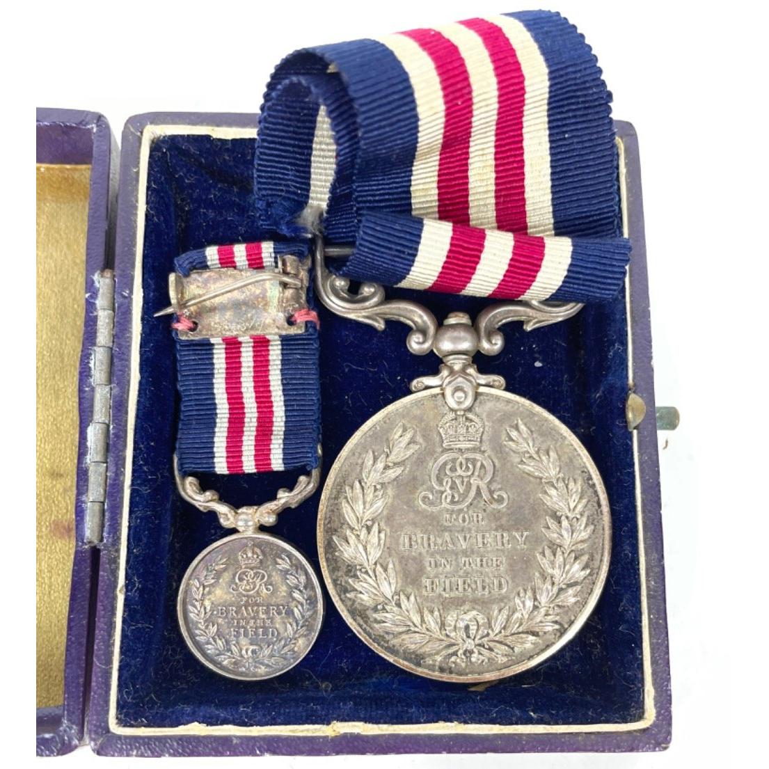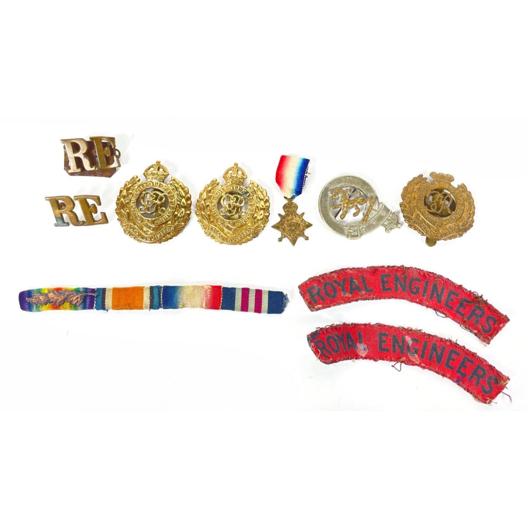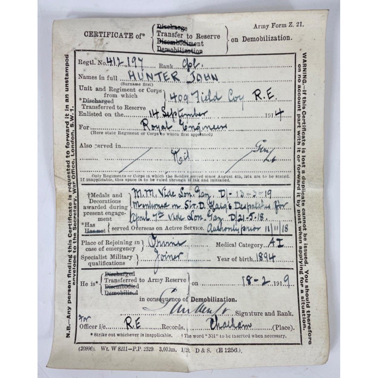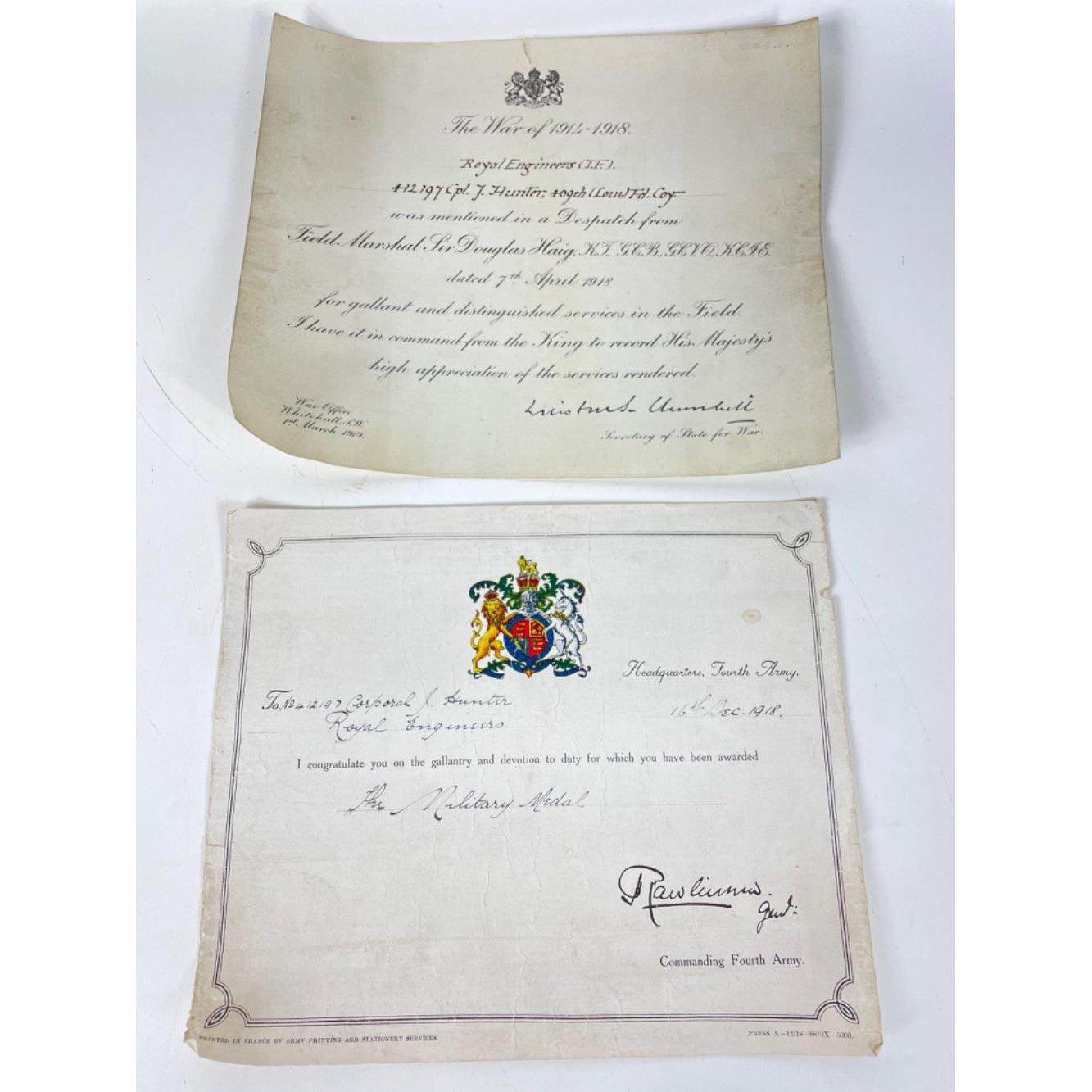 A collection of WWl medals for Corporal G Hunter Royal Engineers to include a Bravery In The Field medal with mount and original ribbon, a miniature copy medal also, and its original presentation box with supporting War Office paperwork and Immediate Awards 1918 list also, with three further service medals with original ribbons to include The Great War For Civilisation 1914-1918 medal, The British War and Victory medals with ribbons and the 1914-15 Star with ribbon with a miniature version with ribbon, with also Royal Engineers shoulder badges, and British Army WW1 RE - Royal Engineers matching pair of brass shoulder titles, three WWl ROYAL ENGINEERS brass cap badges , A SOLDIERS OWN Note Book and Diary for 1919 largely unused, also an Instructions for Observer Posts booklet