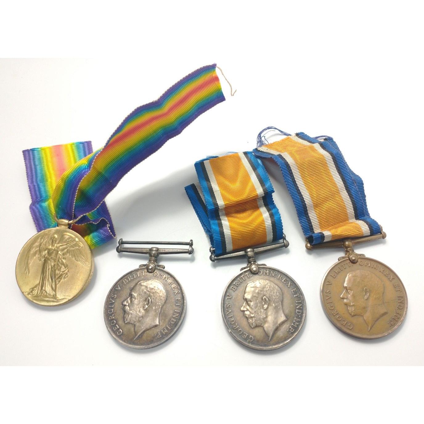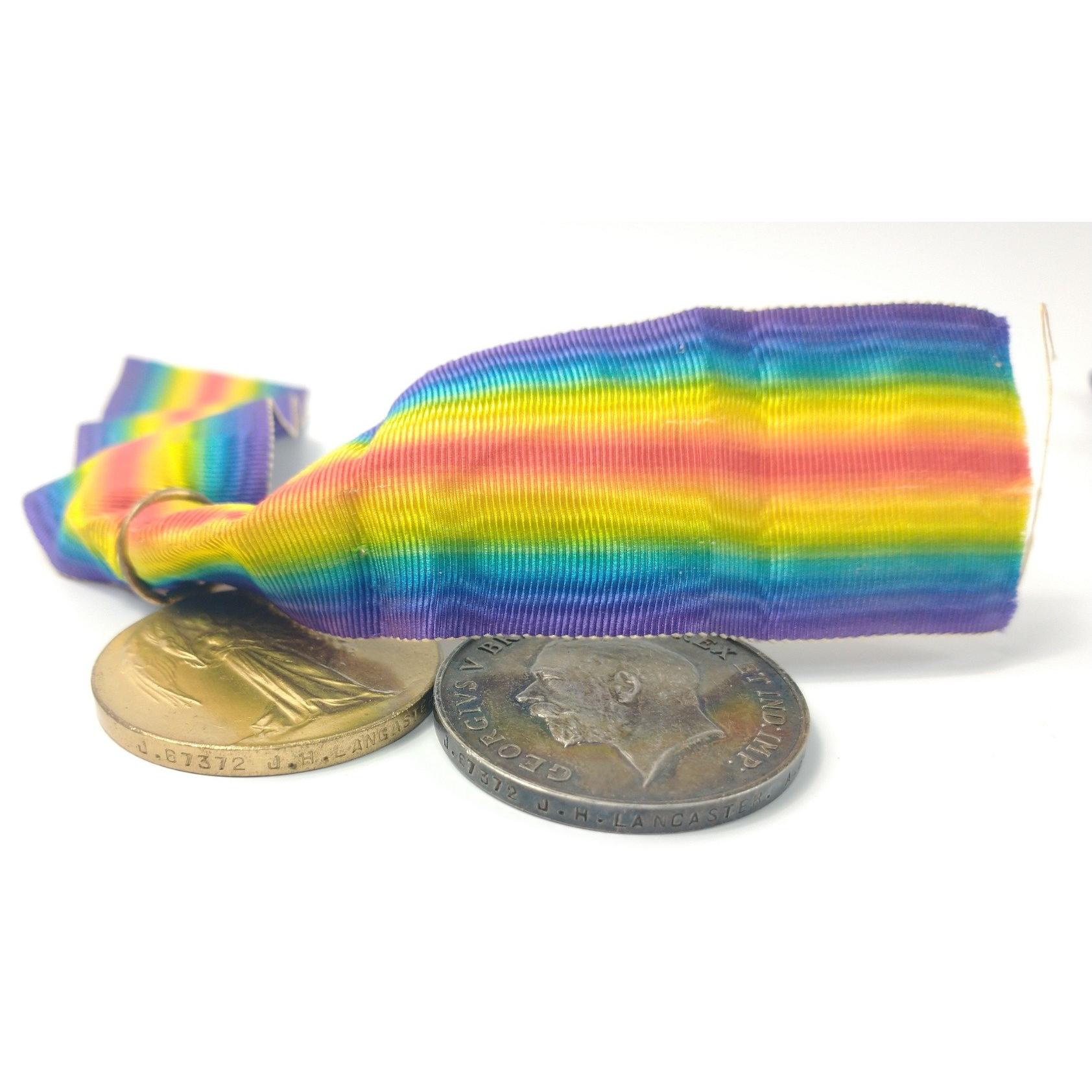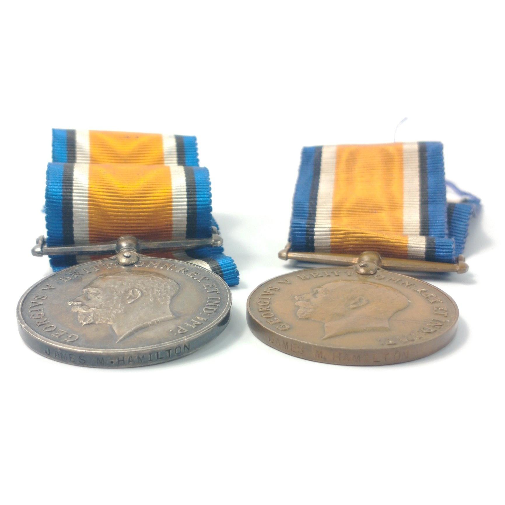 A Set of four WWl Service medals to include Two British War Medals one with ribbon and one without H Lancaster & James Hamilton 1914-1918, The Allied Victory Medal 1914-19(with ribbon), Mercantile marine WWl War medal with ribbon for James Hamilton
