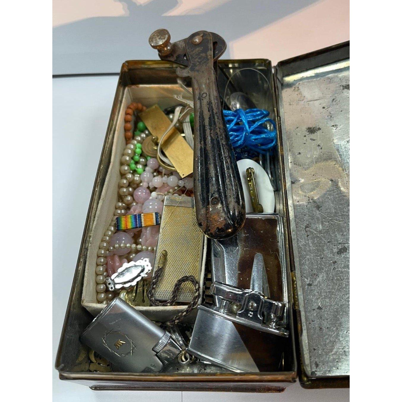 A vintage tin of 'odds n sods' to include an old ladies wristwatch, costume jewellery, some old cigarette lighters etc