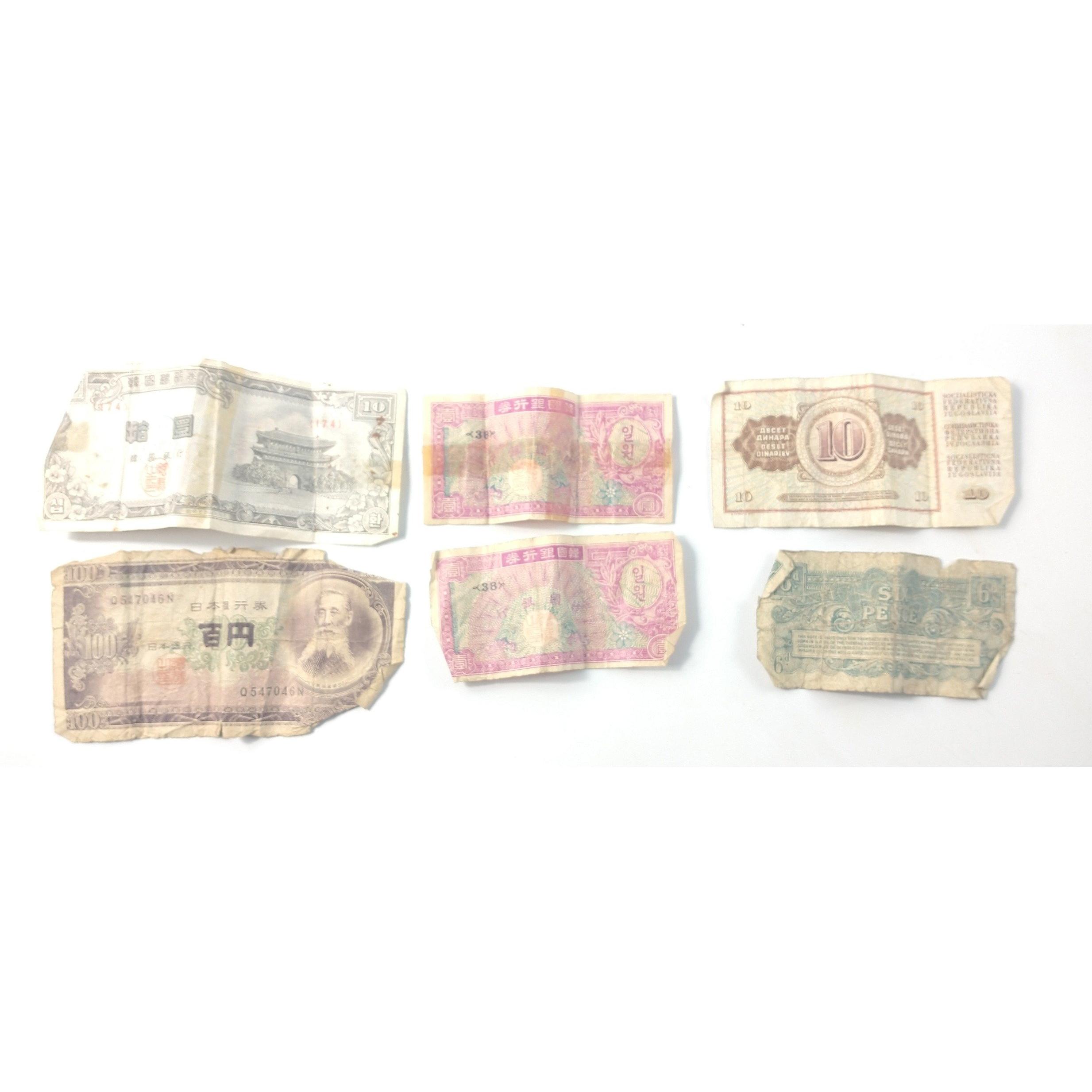 A quantity of six vintage bank notes including a KOREAN 10 HWAN note circa 1950's etcApprox 6 pieces